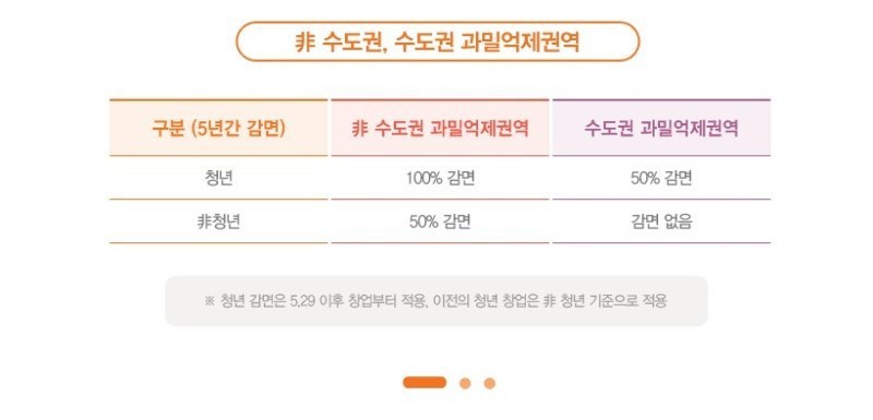 최근 창업중소기업 세액감면제도의 개정에 따라 2018년 5월 29일 이후 창업한 청년창업기업인 경우 수도권 과밀억제권역 외 지역에서는 100% 소득세 감면을 받을 수 있으며, 수도권과밀억제권역 내의 창업이라도 50% 소득세 감면을 받을 수 있습니다.