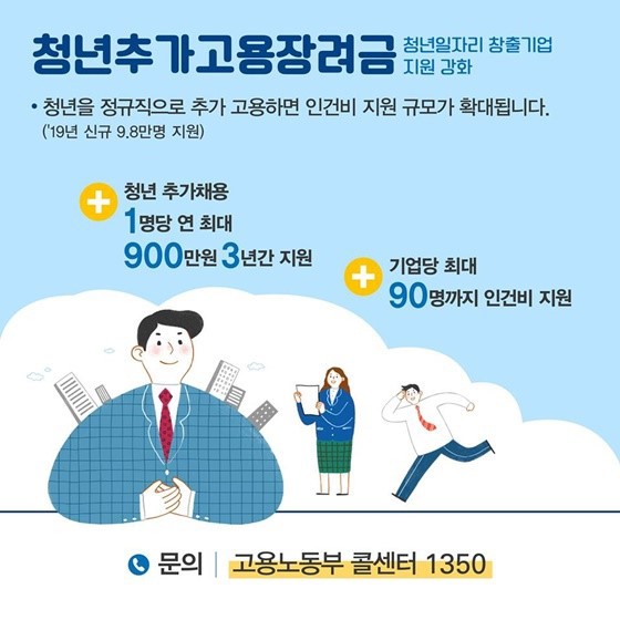 청년추가고용 장려금의 경우 만34세 이하 청년 고용 1명단 연간 900만원/ 3년간 2700만원을 지원하는 제도로서 최저임금 인상에 따른 인건비 부담 증가를 상쇄할 수 있는 아주 좋은 지원금입니다.