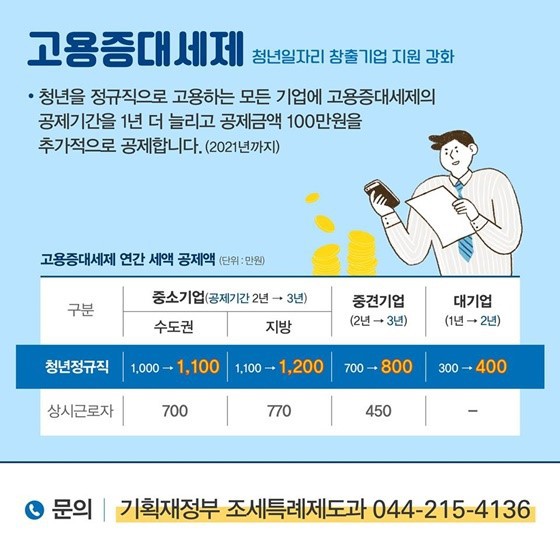 유튜브 크리에이터(유튜버)로서 채널은 운영하기 위해 동영상 편집, 촬영, 그 외 보조 등을 위해 직원을 고용한 경우 청년 정규직의 경우 1명당 1,100만원 , 청년 정규직인 아닌 경우라도 700만원 (수도권 외 지역의 경우 1,200만원 / 770만원) 의 고용증대세액공제를 적용받을 수 있습니다.
