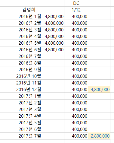 7개월 동안 받은 임금을 전부 더하고, 이를 다시 정상근무기간(7개월)으로 나누면 480만원이 됩니다. 회사는 이 금액을 2016년 연말에 김영희씨의 퇴직연금 계정에 납부하면 됩니다.