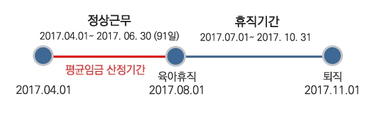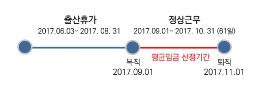 예를 하나 들어보겠습니다. 중소기업에서 일하는 강영숙씨가 2017년 6월 3일부터 8월 31일까지 90일간의 출산휴가를 마치고 업무에 복귀한 다음 11월 1일에 퇴직했다고 해 보겠습니다.