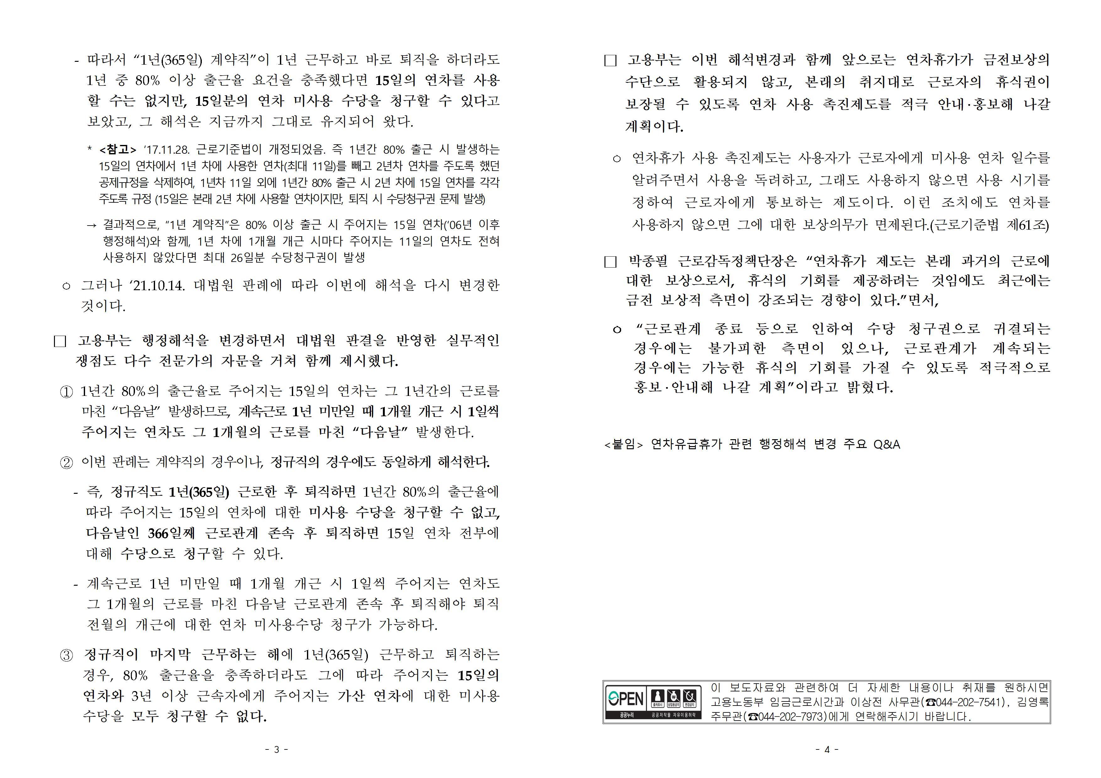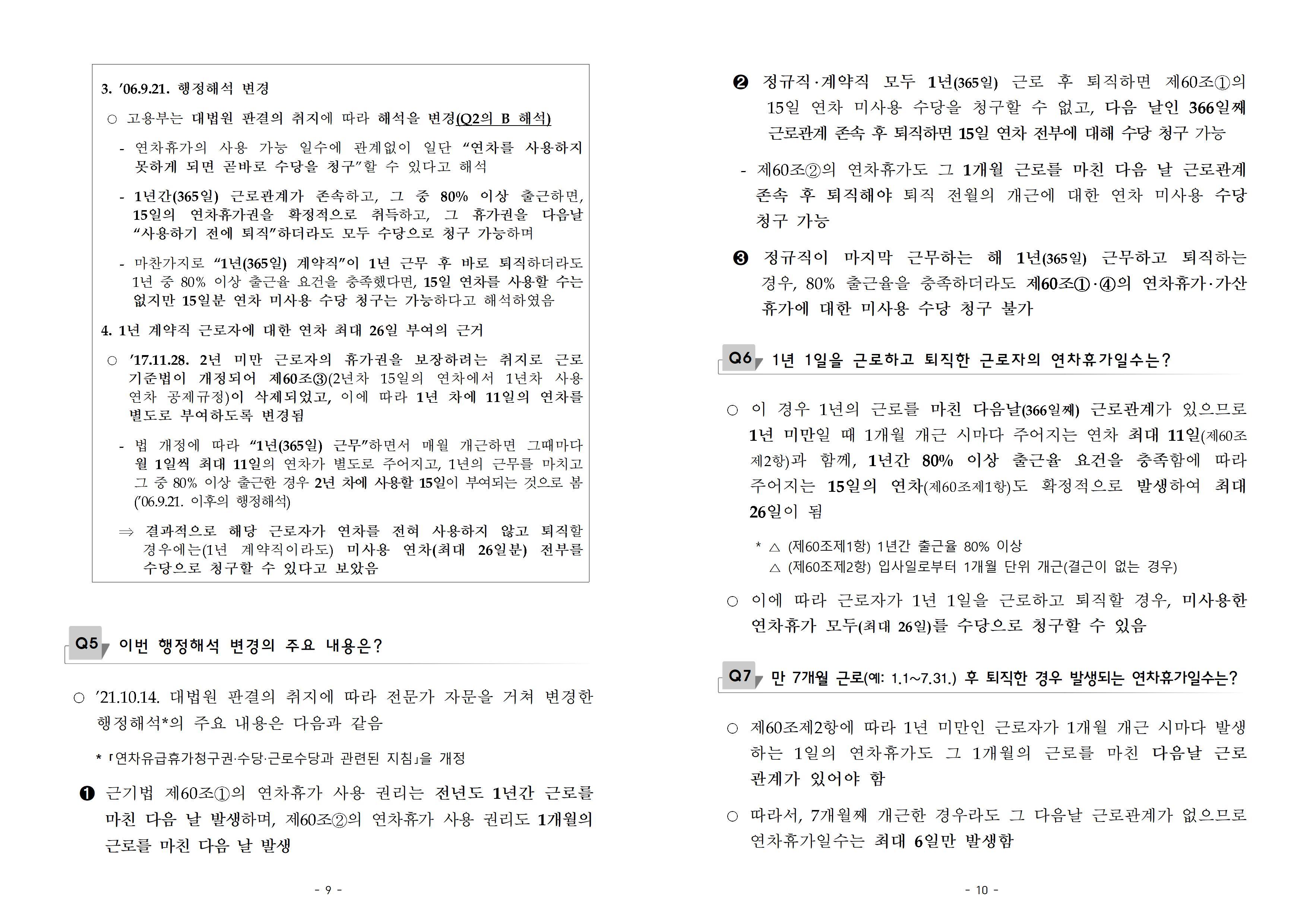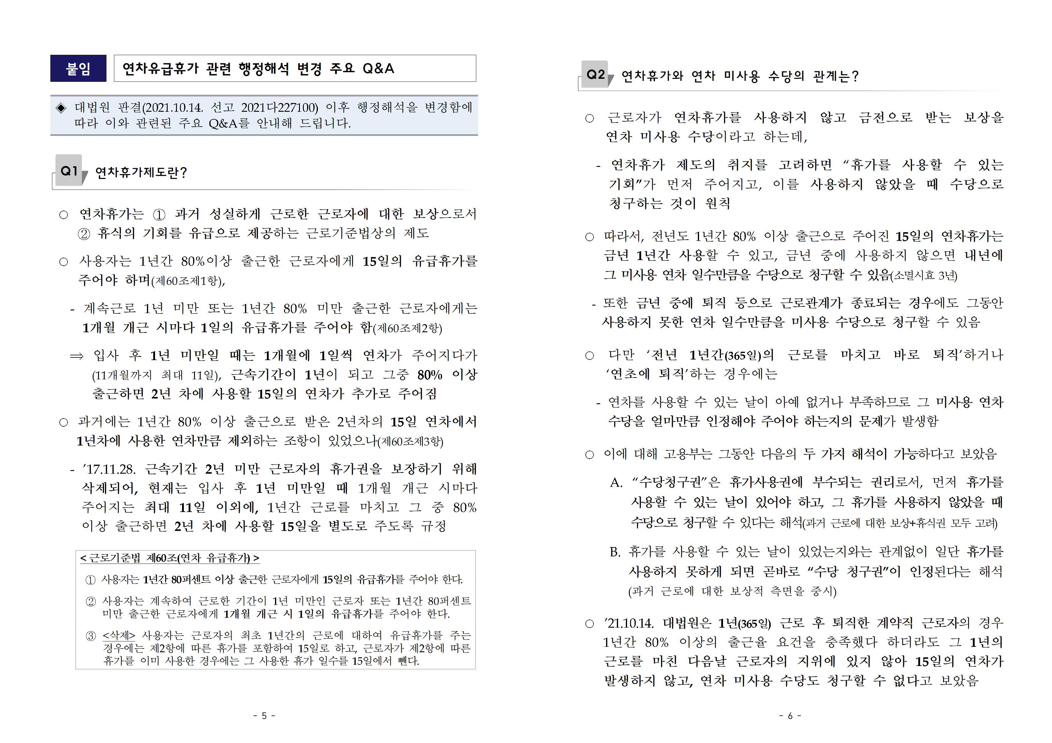 고용부, 연차유급휴가 행정해석 변경 2021-12-16