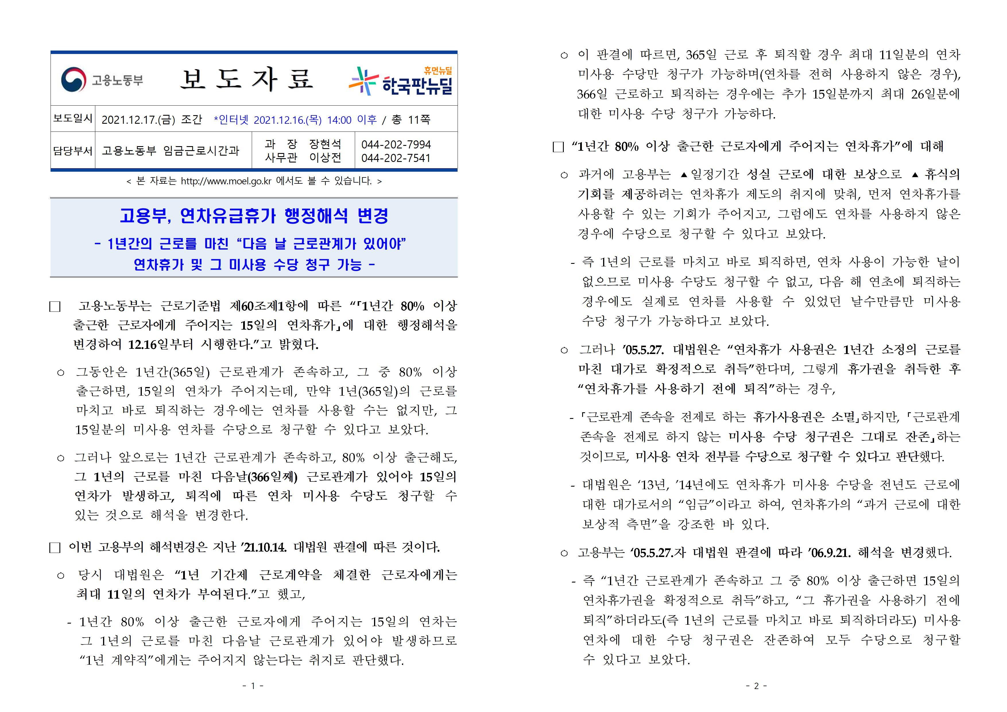 고용노동부는 근로기준법 제60조(연차 유급휴가)제1항에 따른 "1년간 80% 이상 출근한 근로자에게 주어지는 15일의 연차휴가" 에 대한 행정해석을 변경하여 2021.12.16일부터 시행한다.”고 밝혔다.