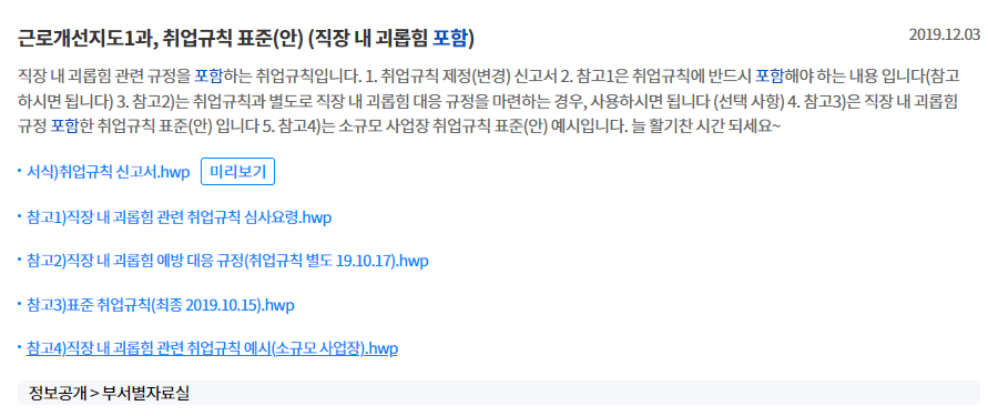 직장 내 괴롭힘 금지 제도 2019.1.15.법 개정 신설 2019.7.16. 시행 => 취업규칙 신설 제12장 2 직장내 괴롭힘의 금지