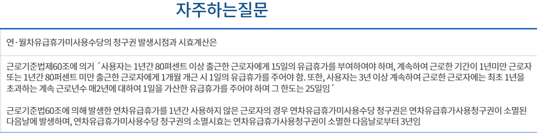 | 근로기준법 제60조(연차 유급휴가) ①사용자는 1년간 80퍼센트 이상 출근한 근로자에게 15일의 유급휴가를 주어야 한다. [개정 2012.2.1] [[시행일 2012.8.2]] ②사용자는 계속하여 근로한 기간이 1년 미만인 근로자 또는 1년간 80퍼센트 미만 출근한 근로자에게 1개월 개근 시 1일의 유급휴가를 주어야 한다. [개정 2012.2.1] [[시행일 2012.8.2]] ③삭제 [2017.11.28] [[시행일 2018.5.29]] ④사용자는 3년 이상 계속하여 근로한 근로자에게는 제1항에 따른 휴가에 최초 1년을 초과하는 계속 근로 연수 매 2년에 대하여 1일을 가산한 유급휴가를 주어야 한다. 이 경우 가산휴가를 포함한 총 휴가 일수는 25일을 한도로 한다. ⑤사용자는 제1항부터 제4항까지의 규정에 따른 휴가를 근로자가 청구한 시기에 주어야 하고, 그 기간에 대하여는 취업규칙 등에서 정하는 통상임금 또는 평균임금을 지급하여야 한다. 다만, 근로자가 청구한 시기에 휴가를 주는 것이 사업 운영에 막대한 지장이 있는 경우에는 그 시기를 변경할 수 있다. ⑥제1항 및 제2항을 적용하는 경우 다음 각 호의 어느 하나에 해당하는 기간은 출근한 것으로 본다. [개정 2012.2.1, 2017.11.28] [[시행일 2018.5.29]] 1. 근로자가 업무상의 부상 또는 질병으로 휴업한 기간 2. 임신 중의 여성이 제74조제1항부터 제3항까지의 규정에 따른 휴가로 휴업한 기간 3. 「남녀고용평등과 일·가정 양립 지원에 관한 법률」 제19조제1항에 따른 육아휴직으로 휴업한 기간 ⑦ 제1항ㆍ제2항 및 제4항에 따른 휴가는 1년간(계속하여 근로한 기간이 1년 미만인 근로자의 제2항에 따른 유급휴가는 최초 1년의 근로가 끝날 때까지의 기간을 말한다) 행사하지 아니하면 소멸된다. 다만, 사용자의 귀책사유로 사용하지 못한 경우에는 그러하지 아니하다. [개정 2020.3.31] |
