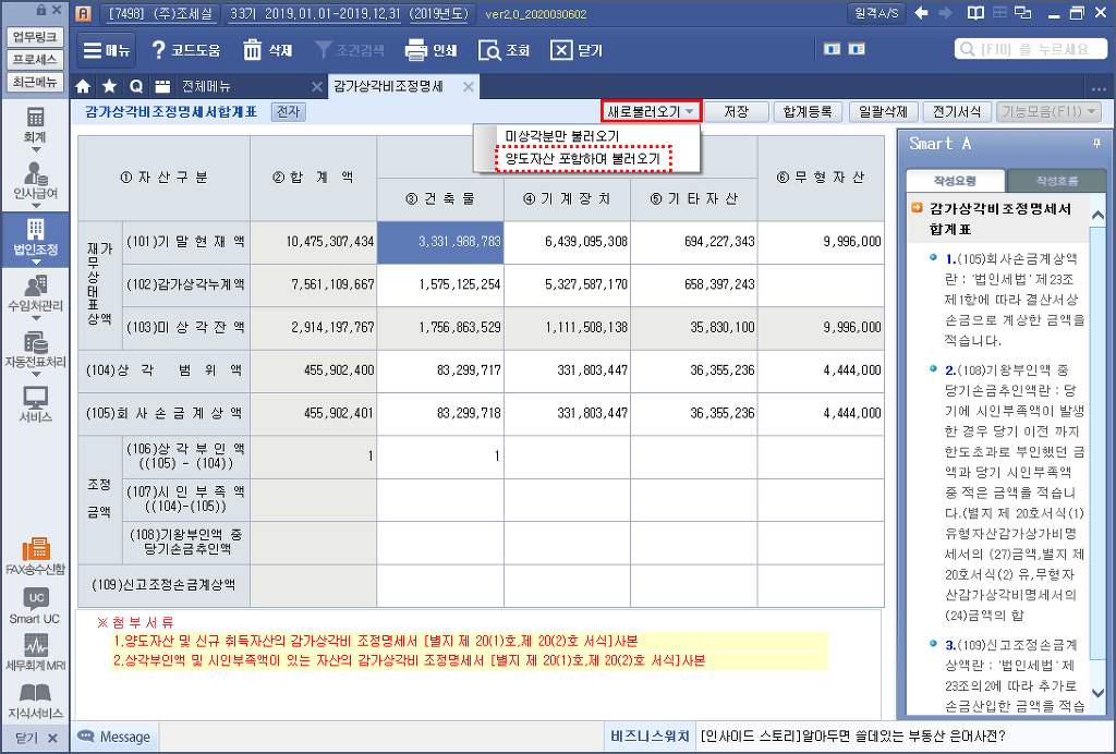 감가상각비조정합계표에 양도자산 부분도 반영됩니다. 미상각분만 반영되어야 하는게 아닌가요? |