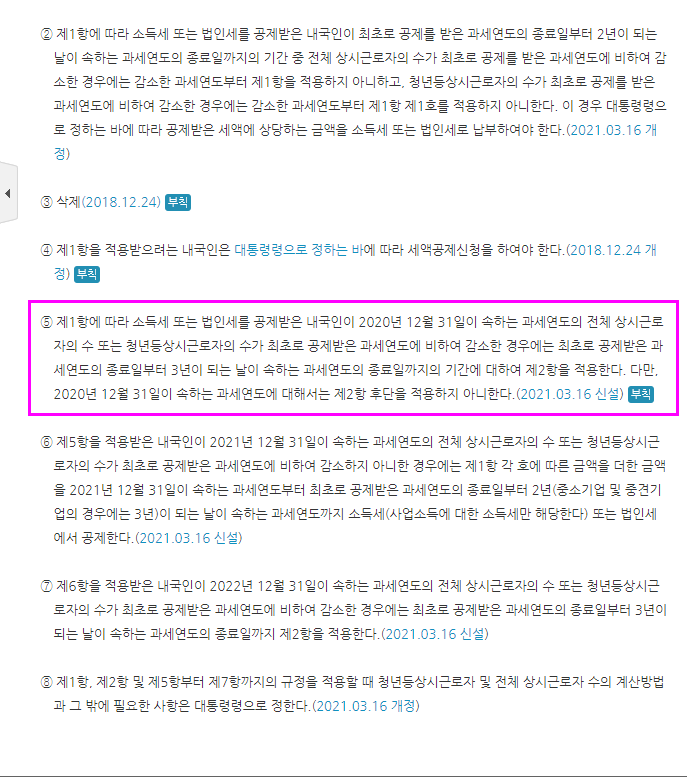 ⑦ 제6항을 적용받은 내국인이 2022년 12월 31일이 속하는 과세연도의 전체 상시근로자의 수 또는 청년등상시근로자의 수가 최초로 공제받은 과세연도에 비하여 감소한 경우에는 최초로 공제받은 과세연도의 종료일부터 3년이 되는 날이 속하는 과세연도의 종료일까지 제2항을 적용한다.(2021.03.16 신설)