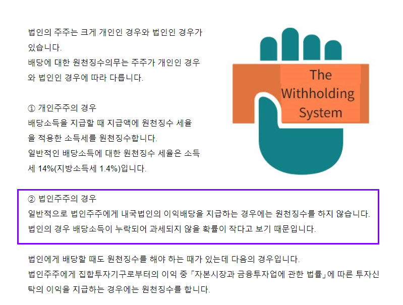 | 법인에게 지급하는 배당소득의 경우는 투자신탁이익의 분배금에 한하여 원천징수하여 납부함 | |