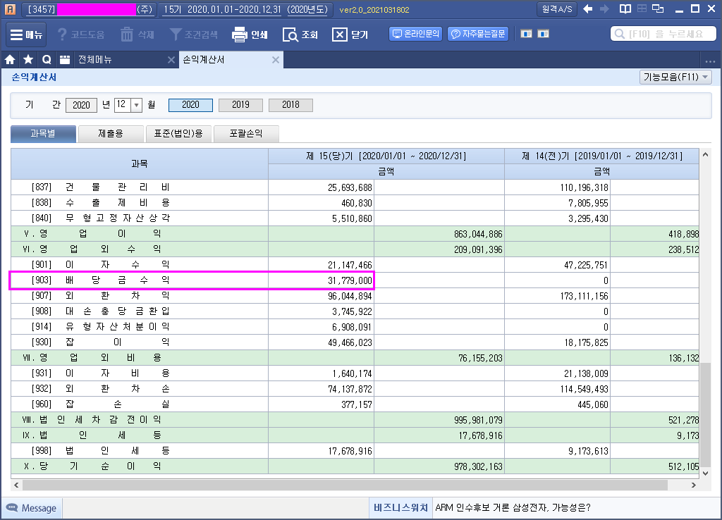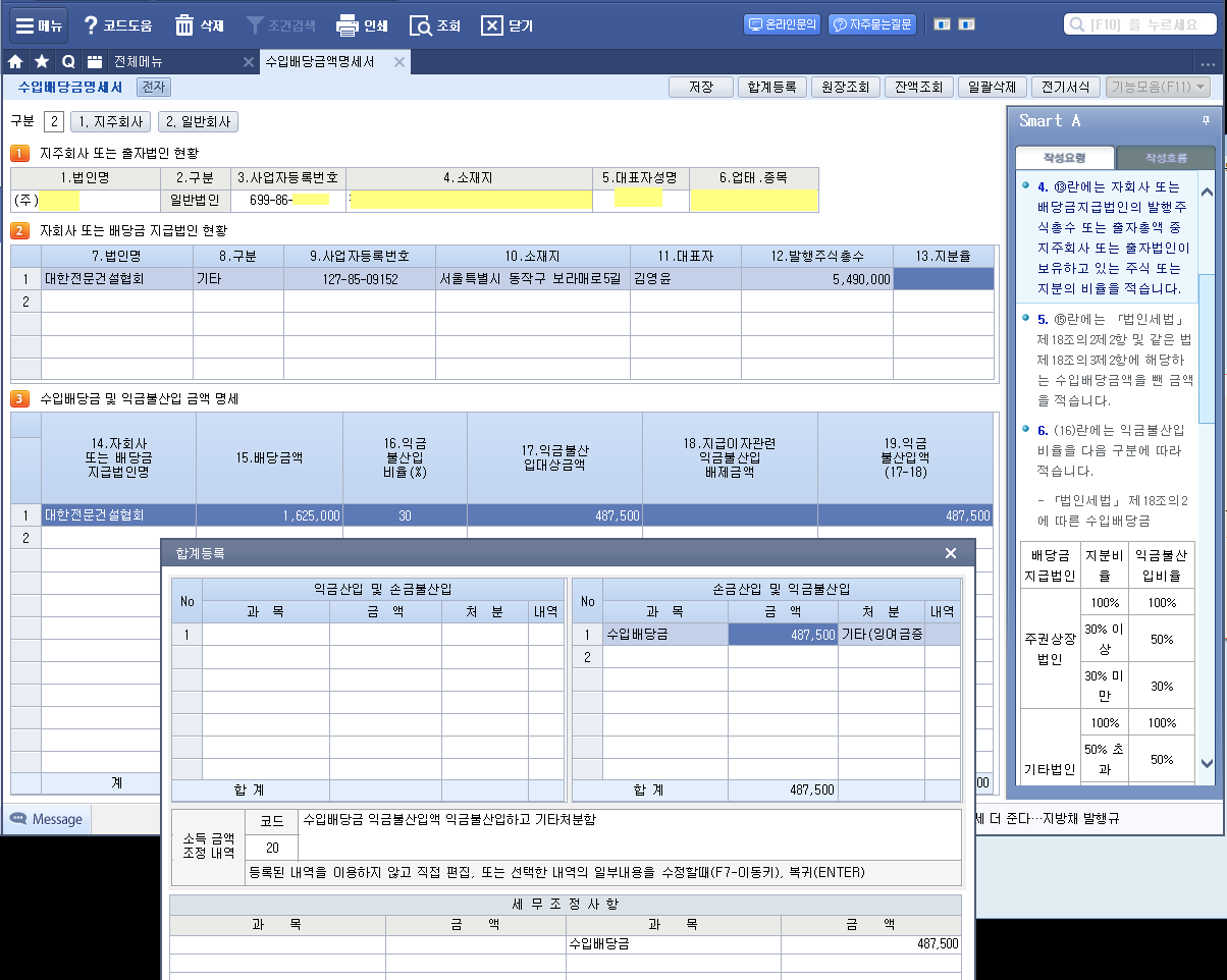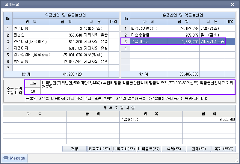 위의 경우 소득구분계산서 작성시 판관비의 ▲금액 처럼 소득구분선택해야 함.