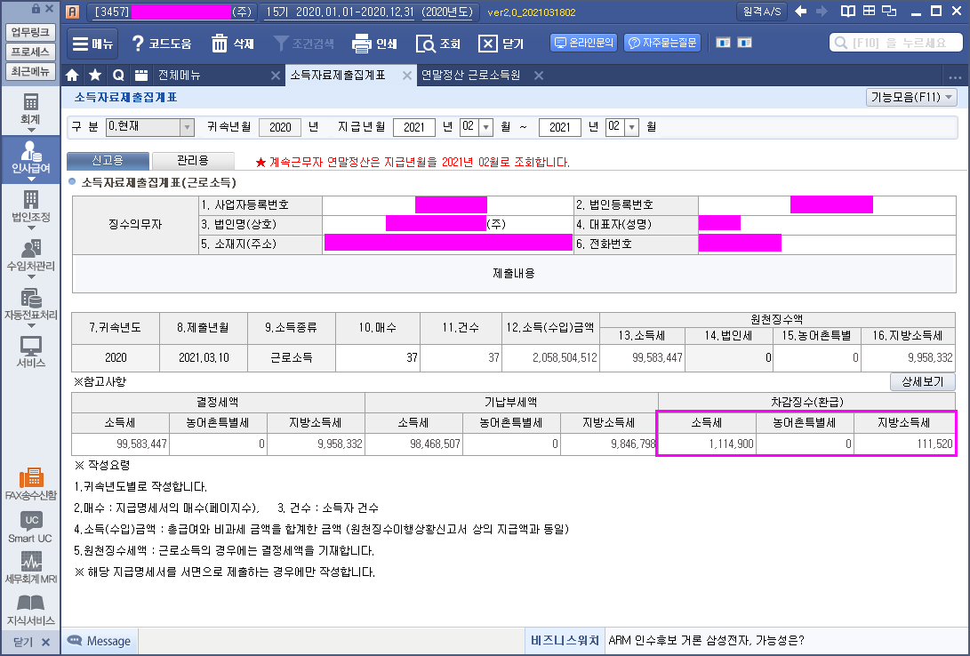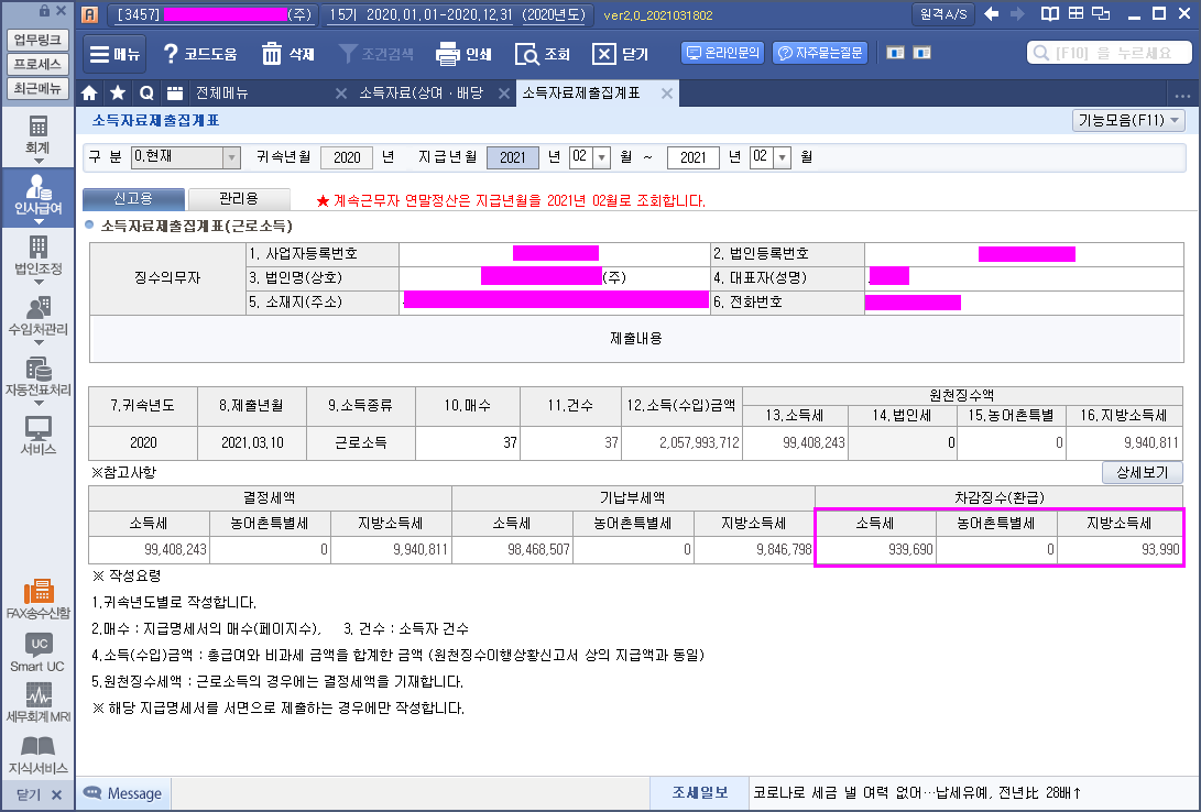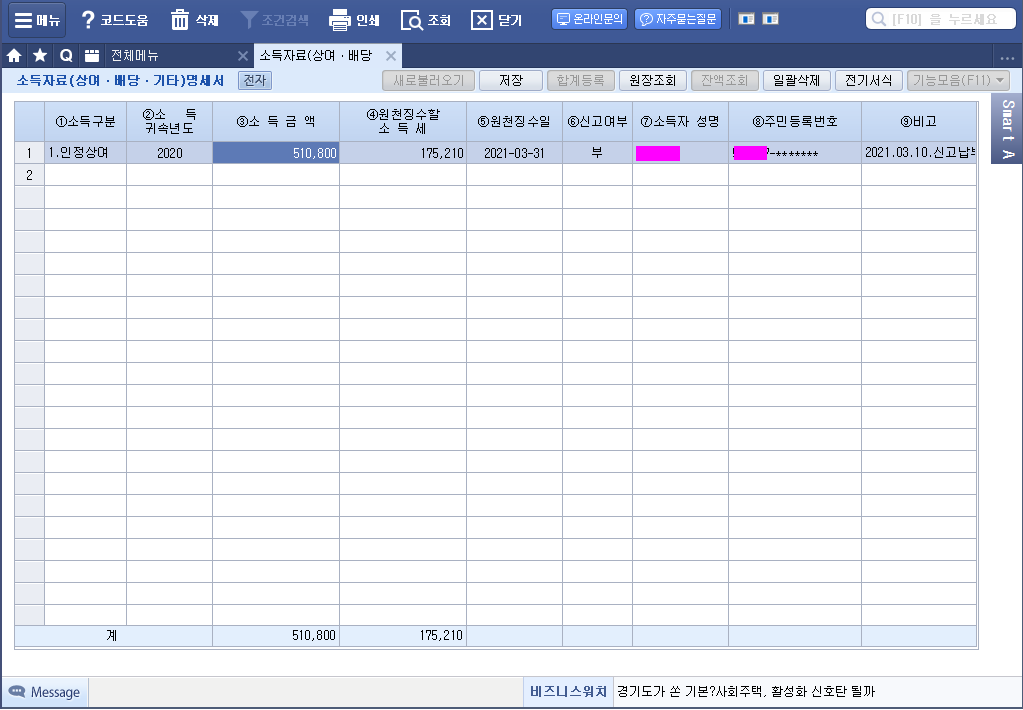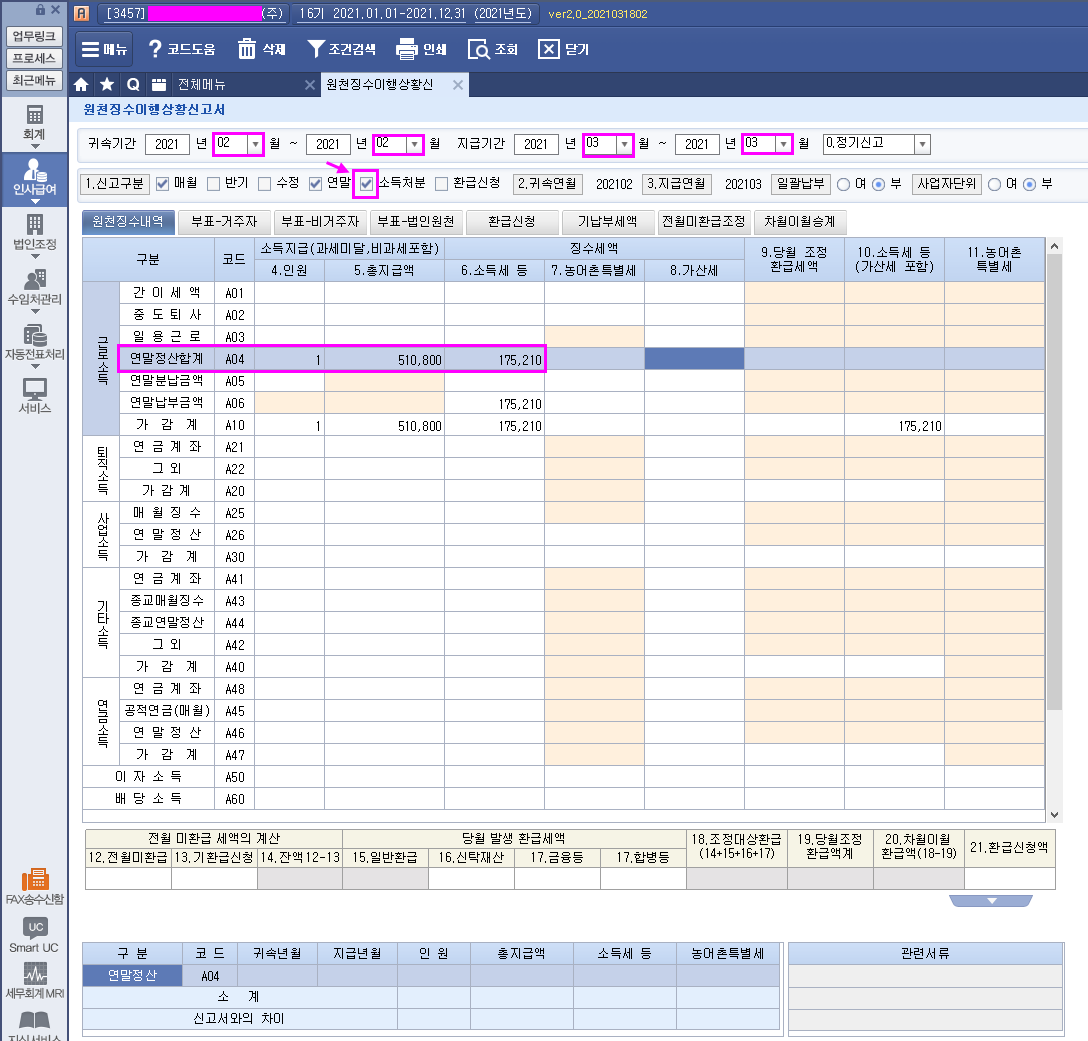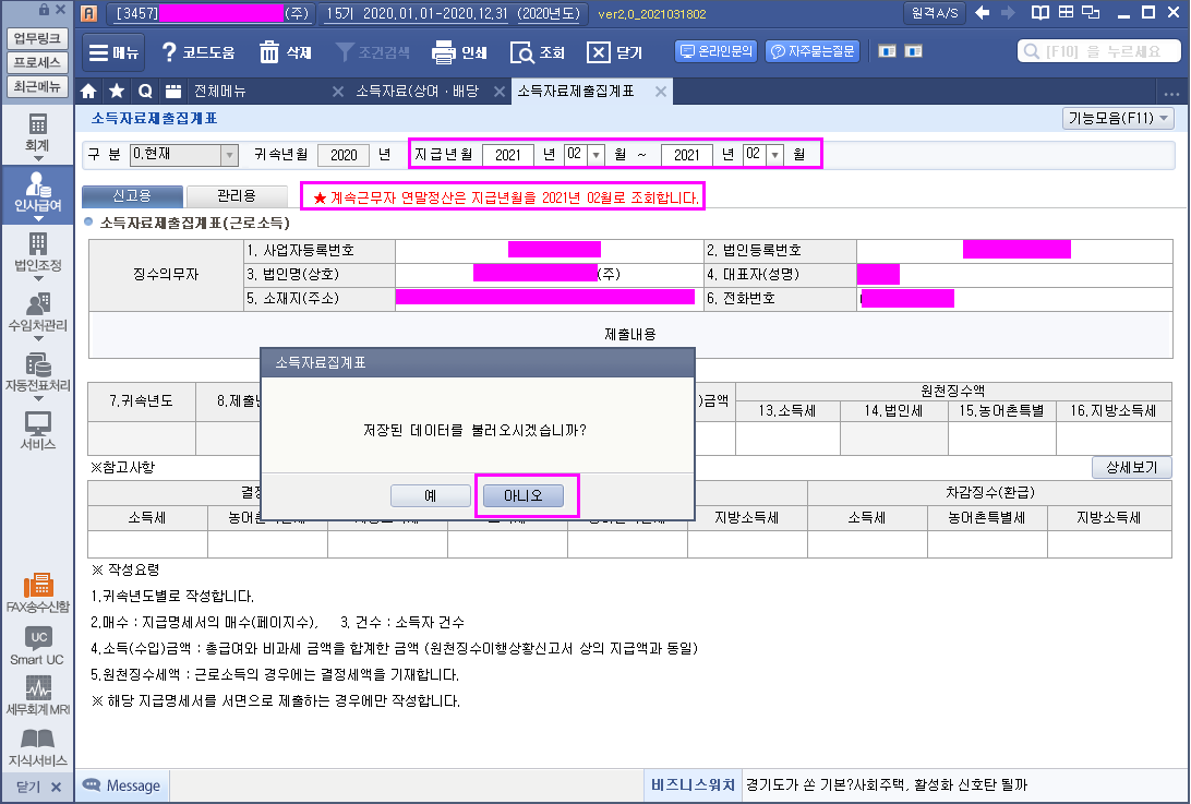 소득자료제출집계표도 수정전에 2021년 02월 ~ 2021년 02월 저장된 데이터를 불러오시겠습니까? 아니오 해서