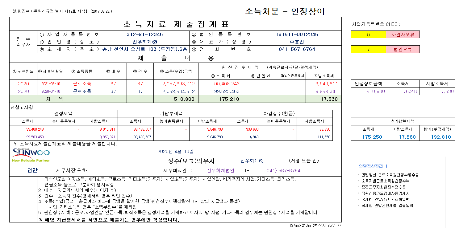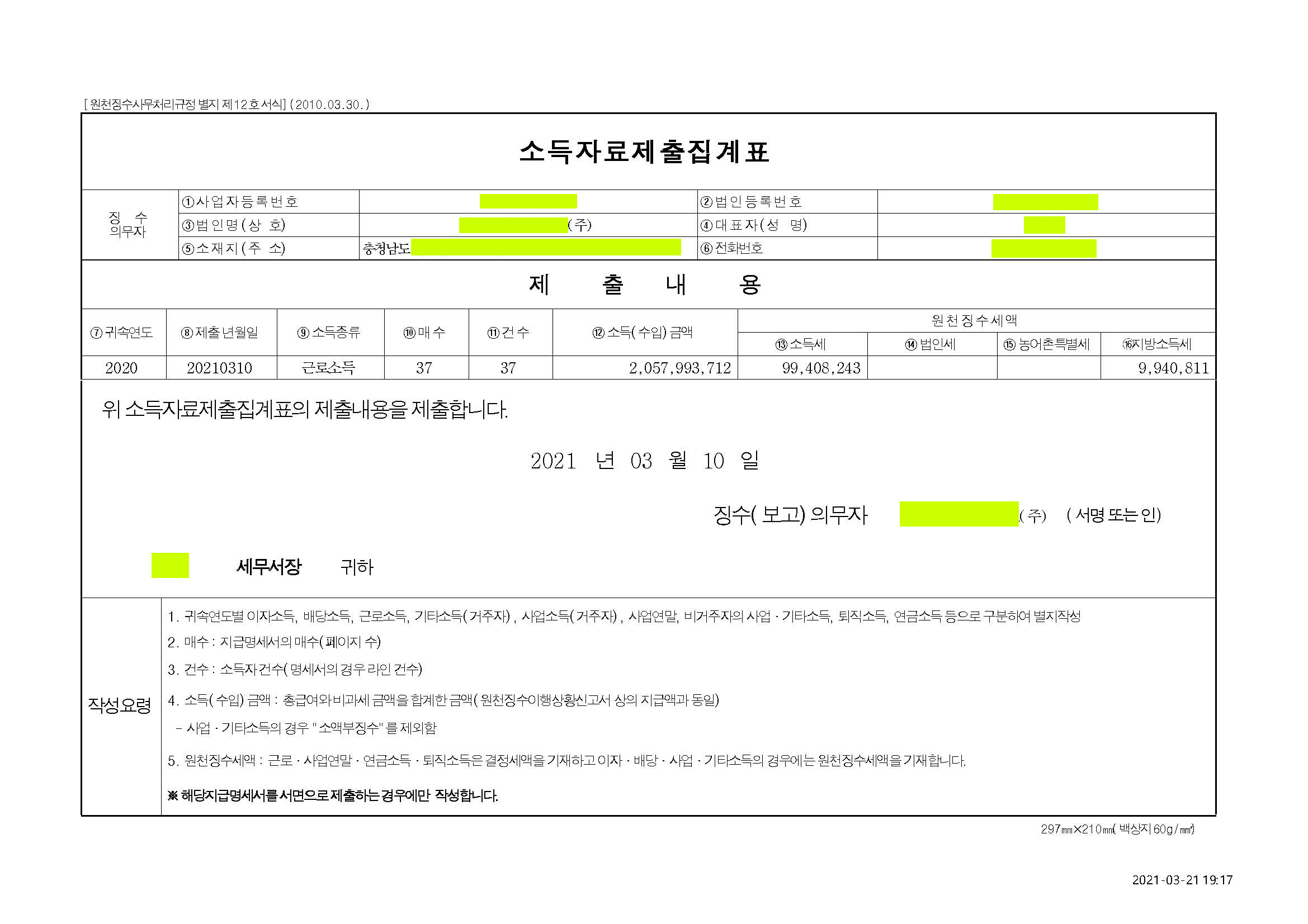 수정전 소득자료제출집계표를 출력 및 pdf로 정한다.
