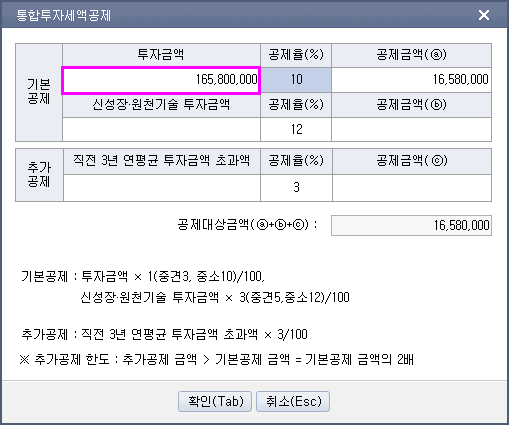 나. 추가공제 금액 : 해당 과세연도에 투자한 금액이 해당 과세연도의 직전 3년간 연 평균 투자 또는 취득금액을 초과하는