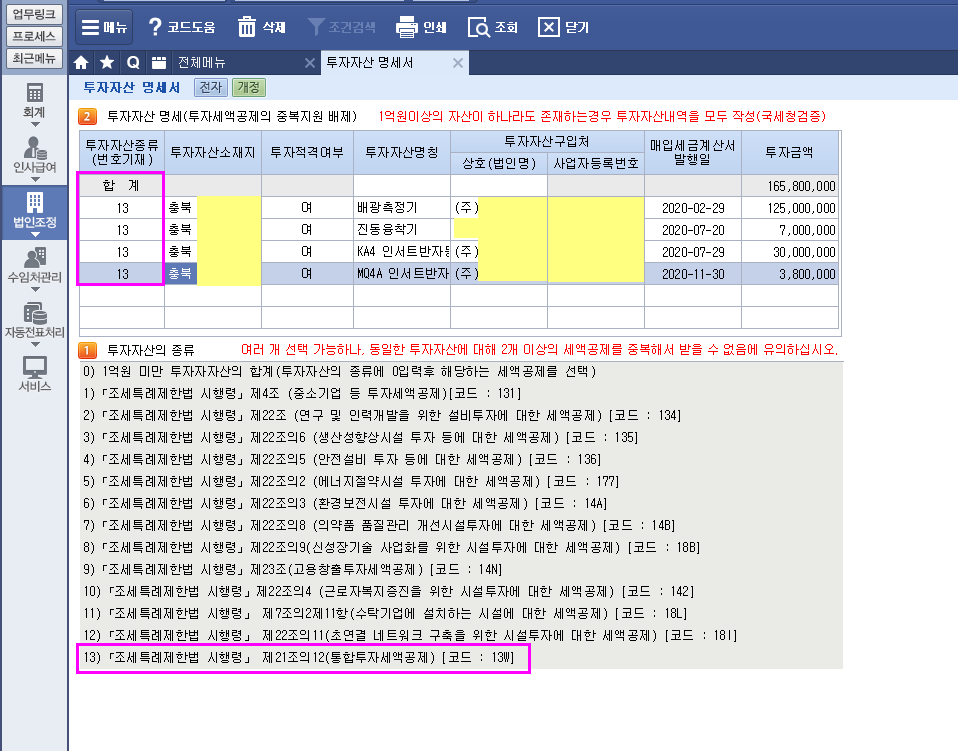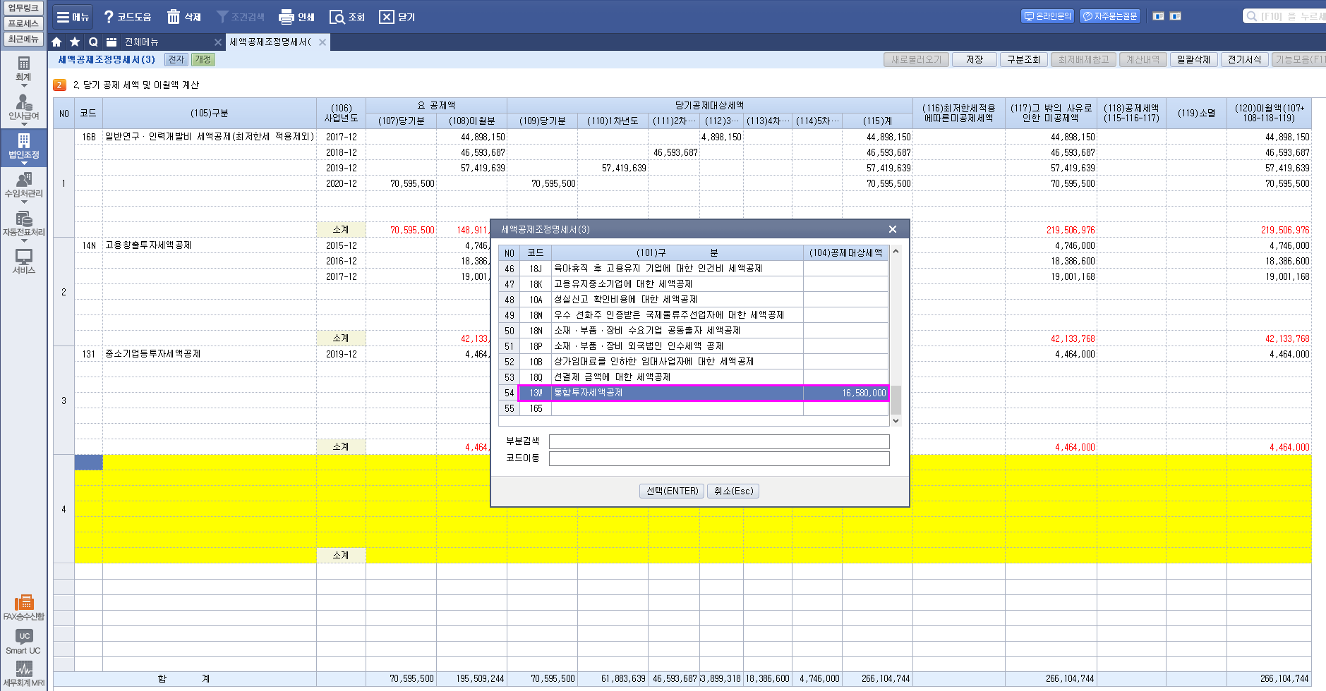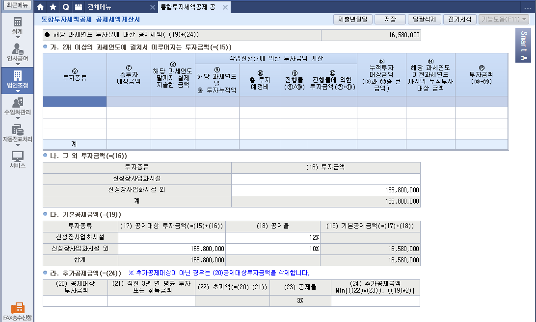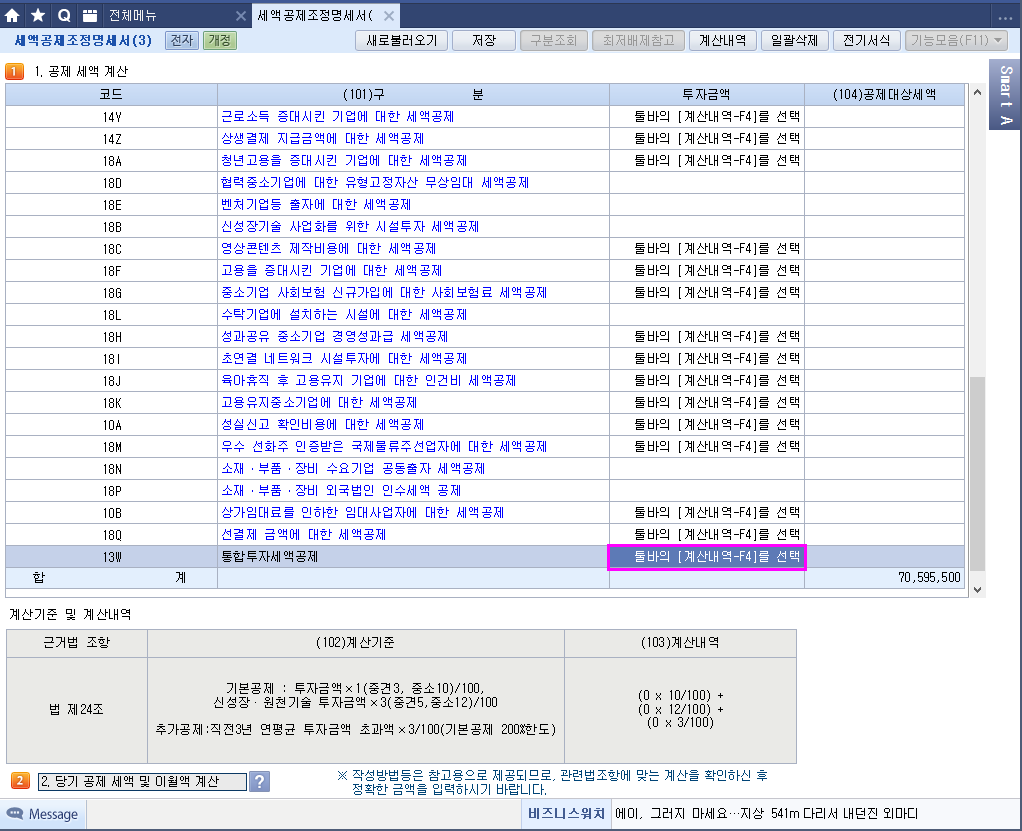 통합투자세액공제 클릭 > F4클릭 > 직접투자금액 입력