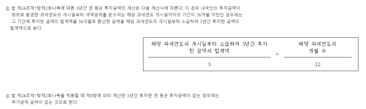 ⑧ 법 제24조제1항제2호나목에 따른 3년간 연 평균 투자금액의 계산은 다음 계산식에 따른다. 이 경우 내국인의 투자금액이