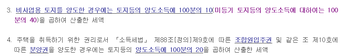 3. 비사업용 토지를 양도한 경우에는 토지등의 양도소득에 100분의 10(미등기 토지등의 양도소득에 대하여는 100분의 40)을 곱하여 산출한 세액