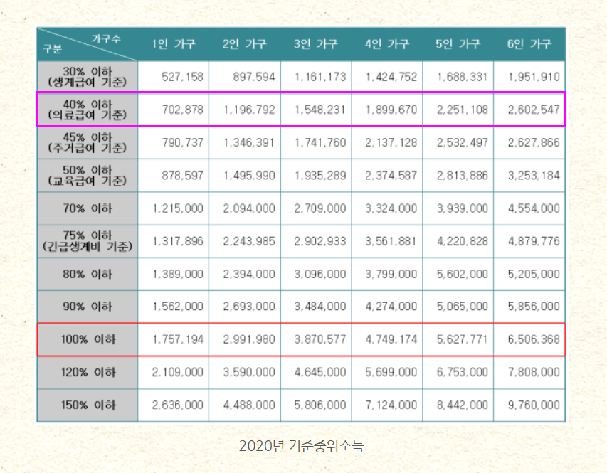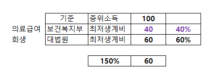관련 집행기준 : 89-154-5 [ 연도별 최저생계비의 범위 ] ☞ 의료급여(중위40%)