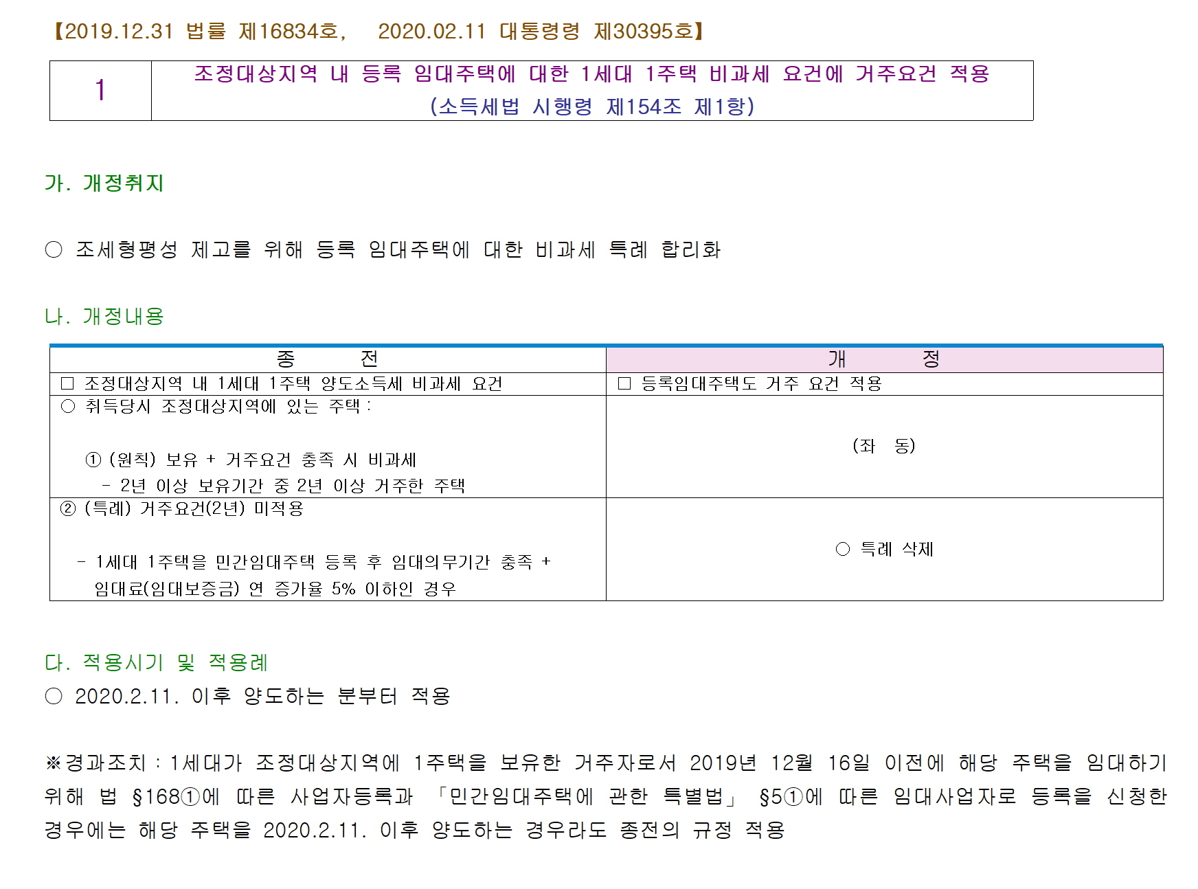 ※경과조치:1세대가 조정대상지역에 1주택을 보유한 거주자로서 2019년 12월 16일 이전에 해당 주택을 임대하기 위해 법 §168①에 따른 사업자등록과 「민간임대주택에 관한 특별법」 §5①에 따른 임대사업자로 등록을 신청한 경우에는 해당 주택을 2020.2.11. 이후 양도하는 경우라도 종전의 규정 적용