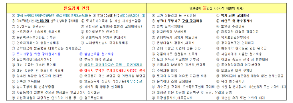 ☞ 용도변경, 개량, 소송・화의비용, 가치증가・내용연수 연장 비용으로서 신용카드매출전표, 세금계산서 등 증명서류를 수취・보관한 경우 (2016.2.17. 이후 지출하는 분부터 적용)에만 필요경비로 인정