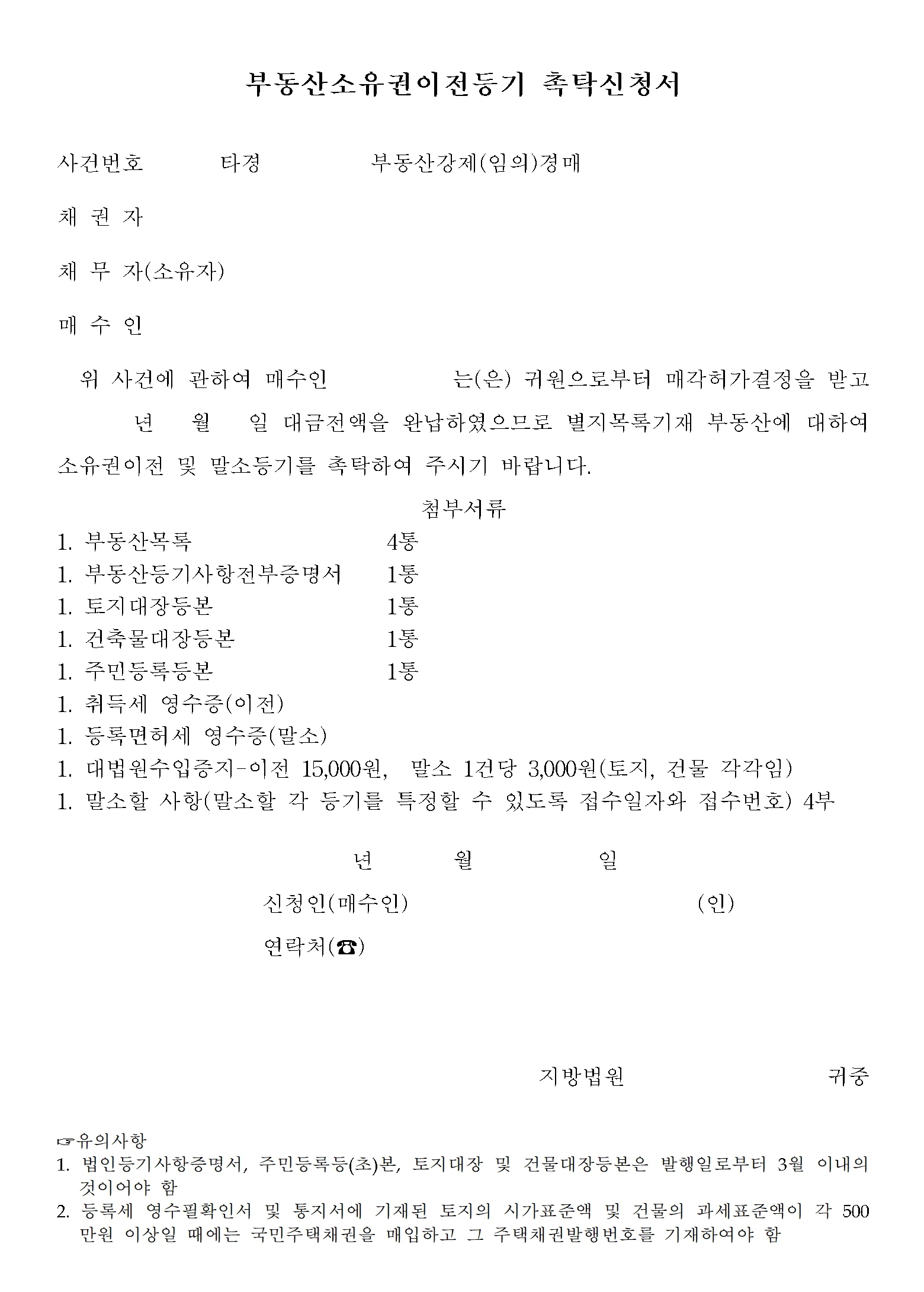 경매 - 매각허가결정문 (매각허가결정정본) (법원-민사집행과분실) 낙찰된 후 1주일 후에 해당법원에 직접 가서 받아야 하는 서류 작성자주황규|작성시간21.04.27|조회수2,005 목록 댓글 0 글자크기 작게가 글자크기 크게가 https://m.blog.naver.com/PostView.nhn?blogId=khn502&logNo=221505111179&proxyReferer=https:%2F%2Fwww.google.com%2F 대한민국 법원 경매정보https://www.courtauction.go.kr/대한민국법원 법원경매정보www.courtauction.go.kr부동산소유권이전등기촉탁신청서.hwp21.50KB 첨부파일첨부된 파일이 9개 있습니다. jpg 파일 주황규.jpg 다운로드 png 파일 경매.png 다운로드 jpg 파일 부동산소유권이전등기 촉탁신청서.jpg 다운로드 hwp 파일 부동산소유권이전등기촉탁신청서.hwp 다운로드 png 파일 타경.png 다운로드 png 파일 경매물건.png 다운로드 png 파일 타경.png 다운로드 png 파일 경매.png 다운로드 png 파일 송달.png 다운로드 다음검색 현재 게시글 추가 기능 열기 북마크 공유하기 신고 센터로 신고 댓글 댓글 0 댓글쓰기 답글쓰기 댓글 리스트