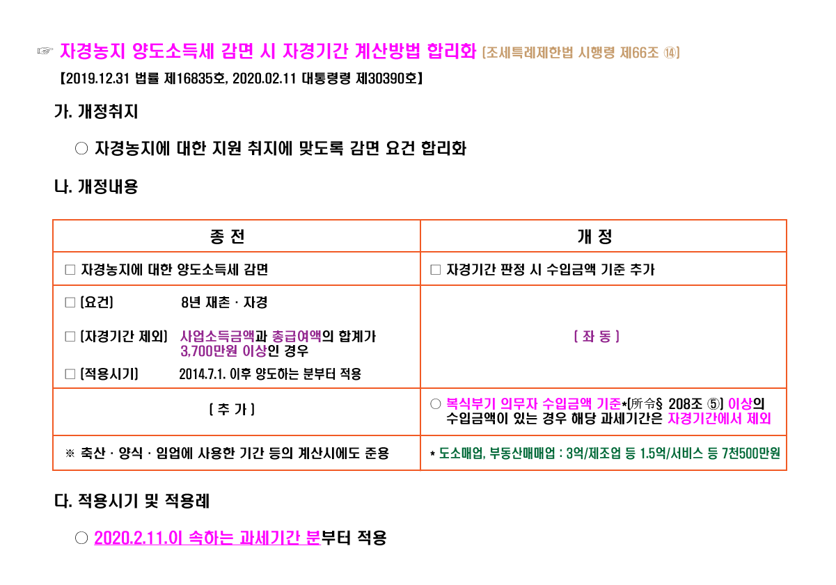 ☞ 자경농지 양도소득세 감면 시 자경기간 계산방법 합리화 (조세특례제한법 제66조 제14항)