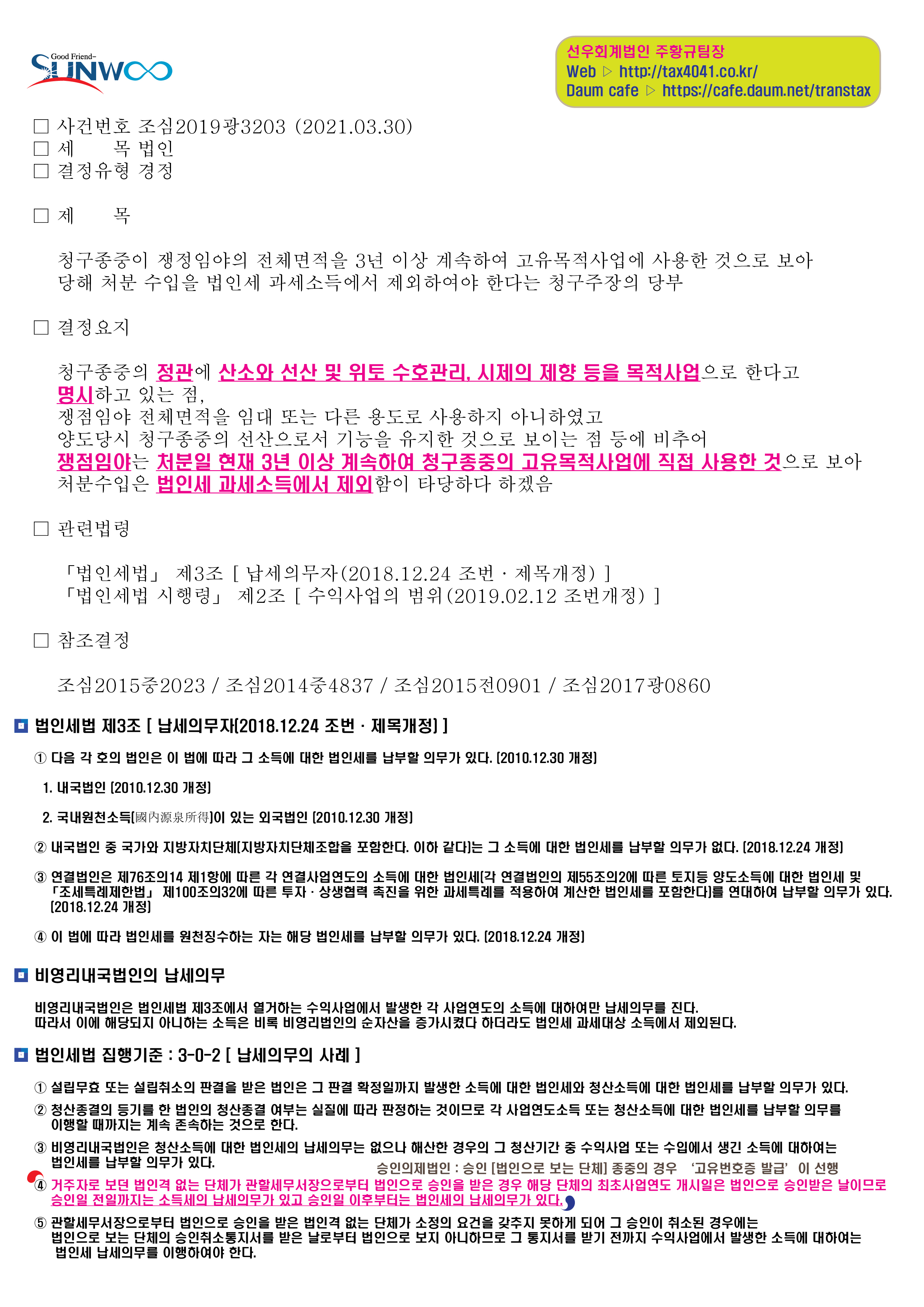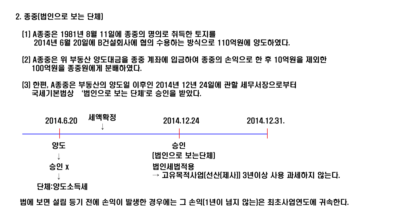 양도소득세 종중 종친 승인의제법인의 경우 법인세신고납부 및 고유목적 3년 이행 여부 (세무서 고유번호증 신청·승인 선행)