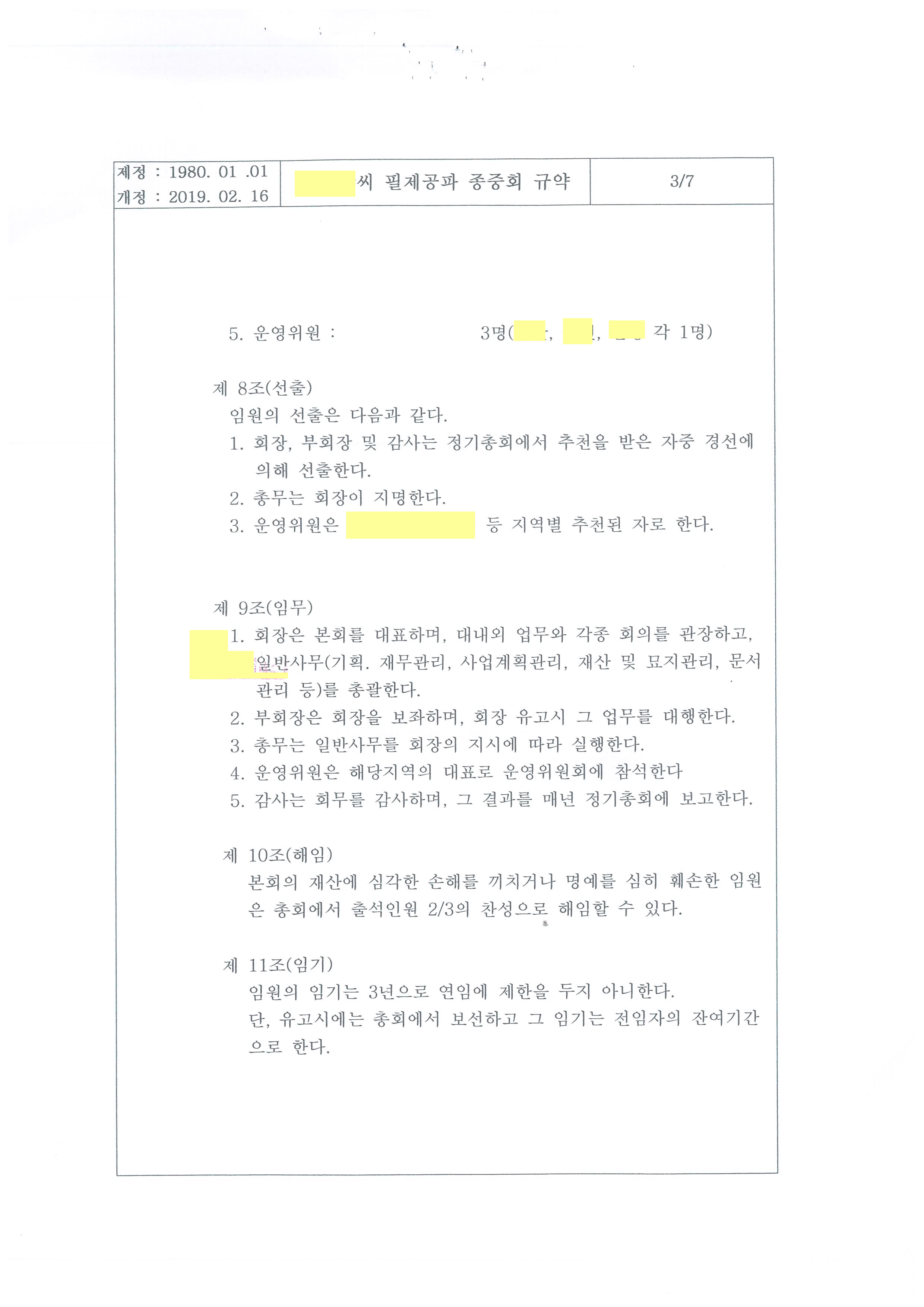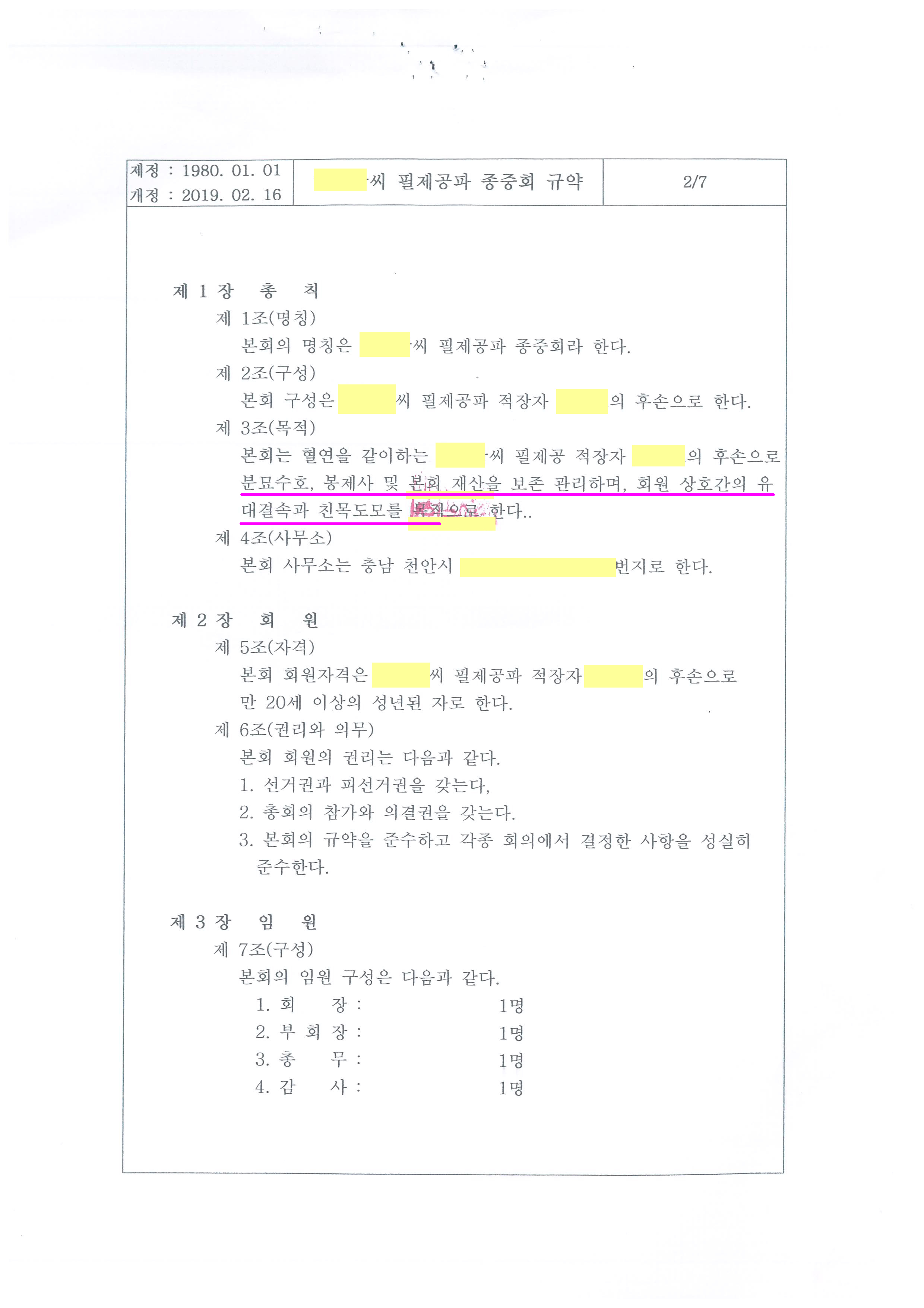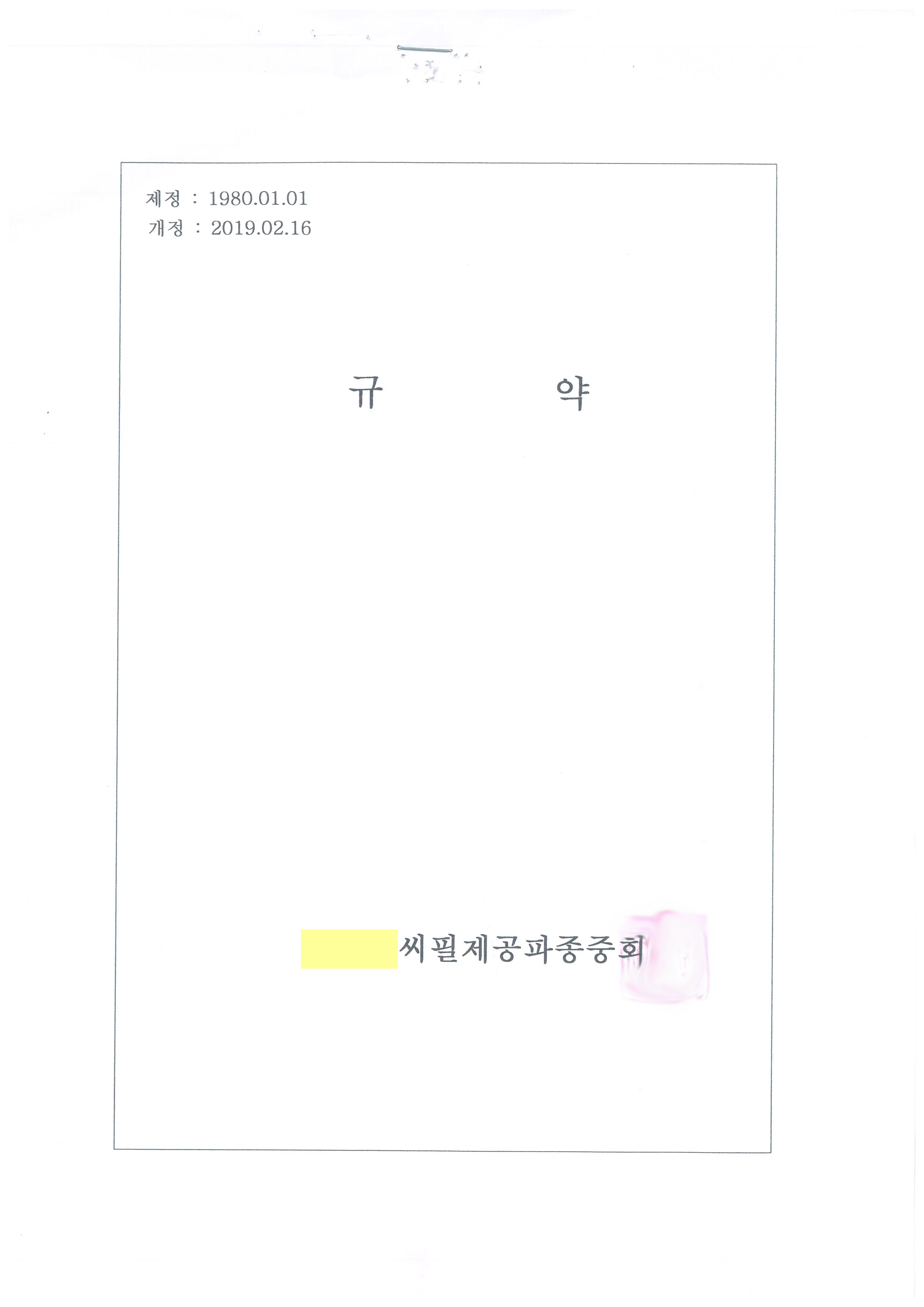 | ▶ 고유번호증 2장, (1page ○○○-82-○○○○○) 2page 법인으로 보는 단체의 국세에 관한 의무이행자 지정통지서) ▶ 종중 규약(정관),회칙(정관) (○○○씨 필제공파 종중회 규약) · 제1장 총칙 제 3조(목적) 본회는 혈연을 같이하는 ○○○씨 필제공 적장자 ○○○의 후손으로 분묘수호, 봉제사 및 본회 재산을 보존 관리하며, 상호간의 유대결속과 친목도모를 목적으로 한다. ▶ 종중 구성원 명단 (종원명단) ▶ 종중회의록 (양도시) (○○○씨 필제공파 종중 운영위원회 회의록(결의서) 임야(선산여부),농지(자경여부)등의 수익금액의 지출내역 (종중계좌입금?) , 자유처분금지, 부동산처분시 종중 계좌 입금여부, 향후 처분시 합산 종중대표자 관할세무서?? 항공사진,지적도,묘역(분묘),묘소잔디보수 및 묘역정화,선산관리와 경계선(철조망설치) 설치공사 관련 식대등,선산묘지의 잡초제거 |