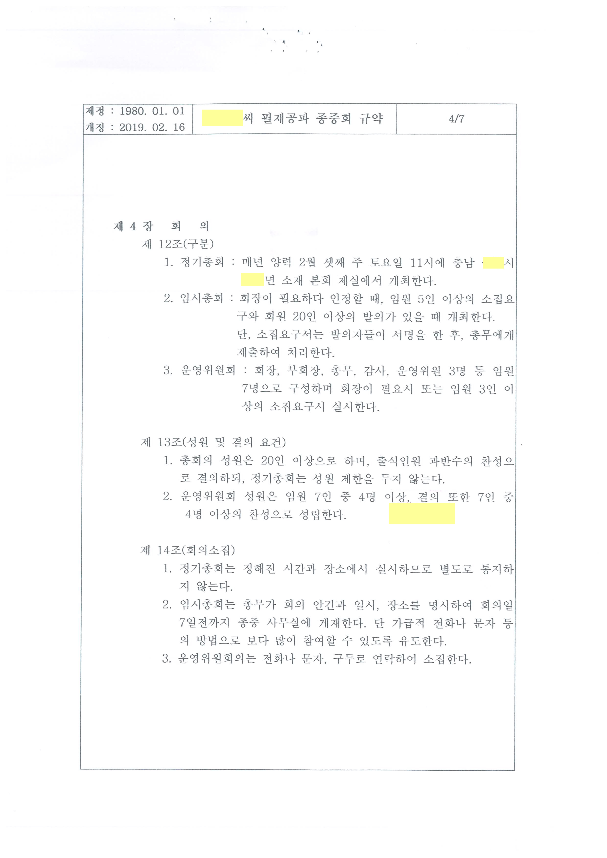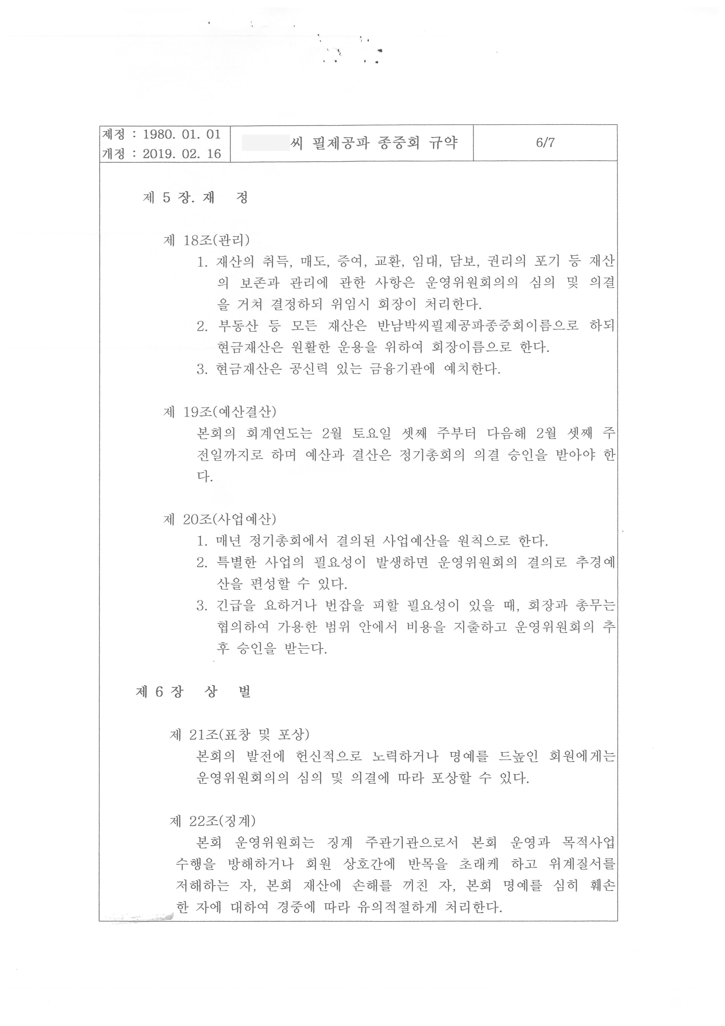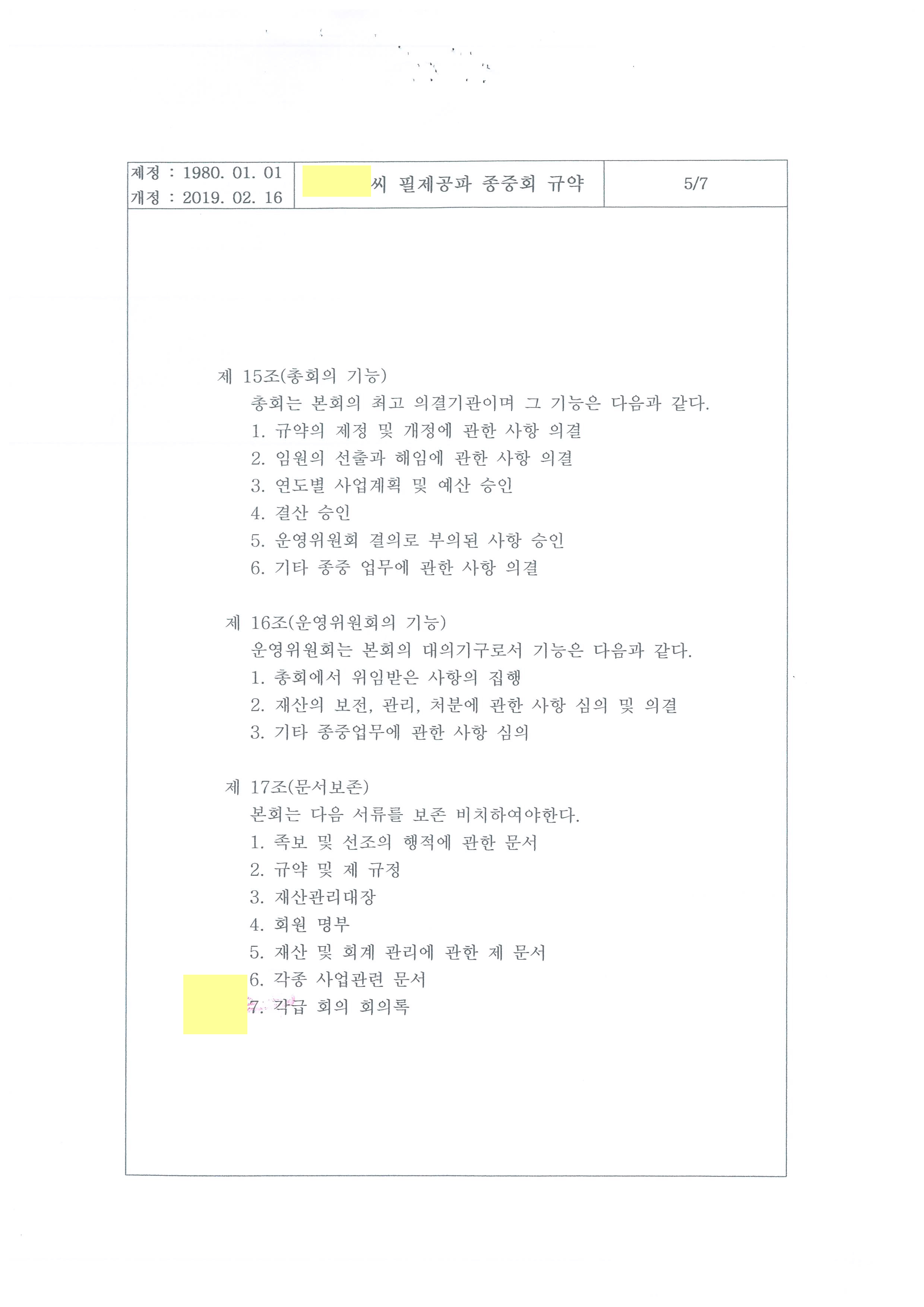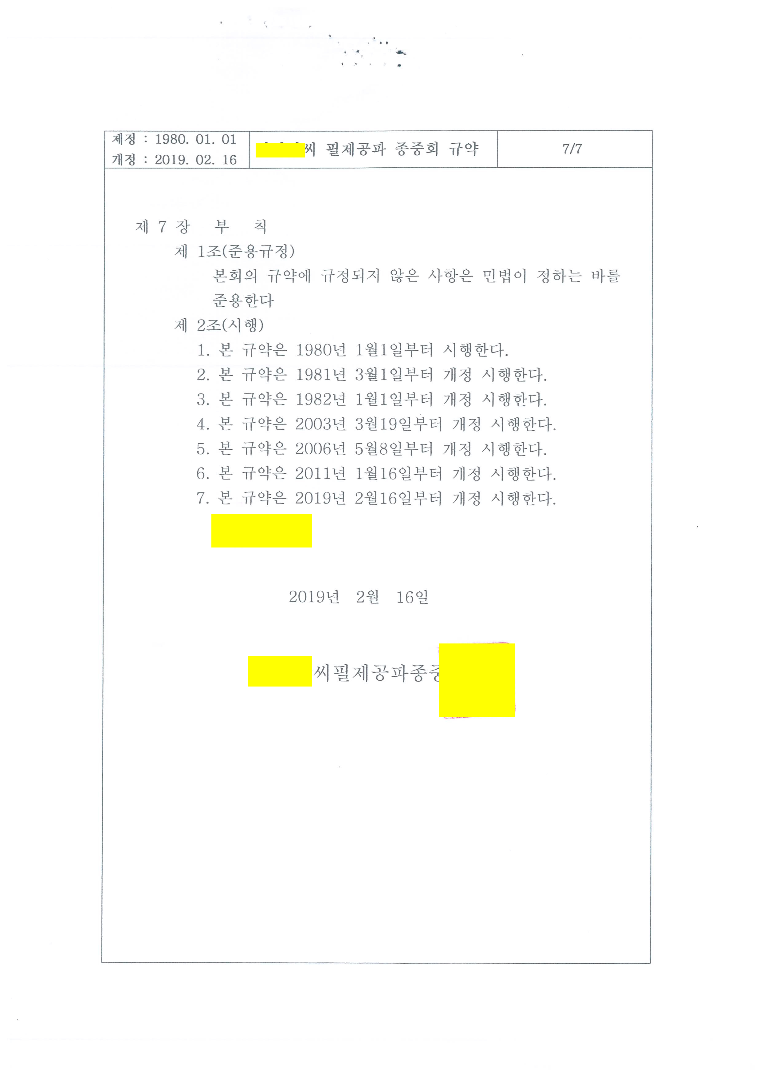 | ▶ 고유번호증 2장, (1page ○○○-82-○○○○○) 2page 법인으로 보는 단체의 국세에 관한 의무이행자 지정통지서) ▶ 종중 규약(정관),회칙(정관) (○○○씨 필제공파 종중회 규약) · 제1장 총칙 제 3조(목적) 본회는 혈연을 같이하는 ○○○씨 필제공 적장자 ○○○의 후손으로 분묘수호, 봉제사 및 본회 재산을 보존 관리하며, 상호간의 유대결속과 친목도모를 목적으로 한다. ▶ 종중 구성원 명단 (종원명단) ▶ 종중회의록 (양도시) (○○○씨 필제공파 종중 운영위원회 회의록(결의서) 임야(선산여부),농지(자경여부)등의 수익금액의 지출내역 (종중계좌입금?) , 자유처분금지, 부동산처분시 종중 계좌 입금여부, 향후 처분시 합산 종중대표자 관할세무서?? 항공사진,지적도,묘역(분묘),묘소잔디보수 및 묘역정화,선산관리와 경계선(철조망설치) 설치공사 관련 식대등,선산묘지의 잡초제거 |