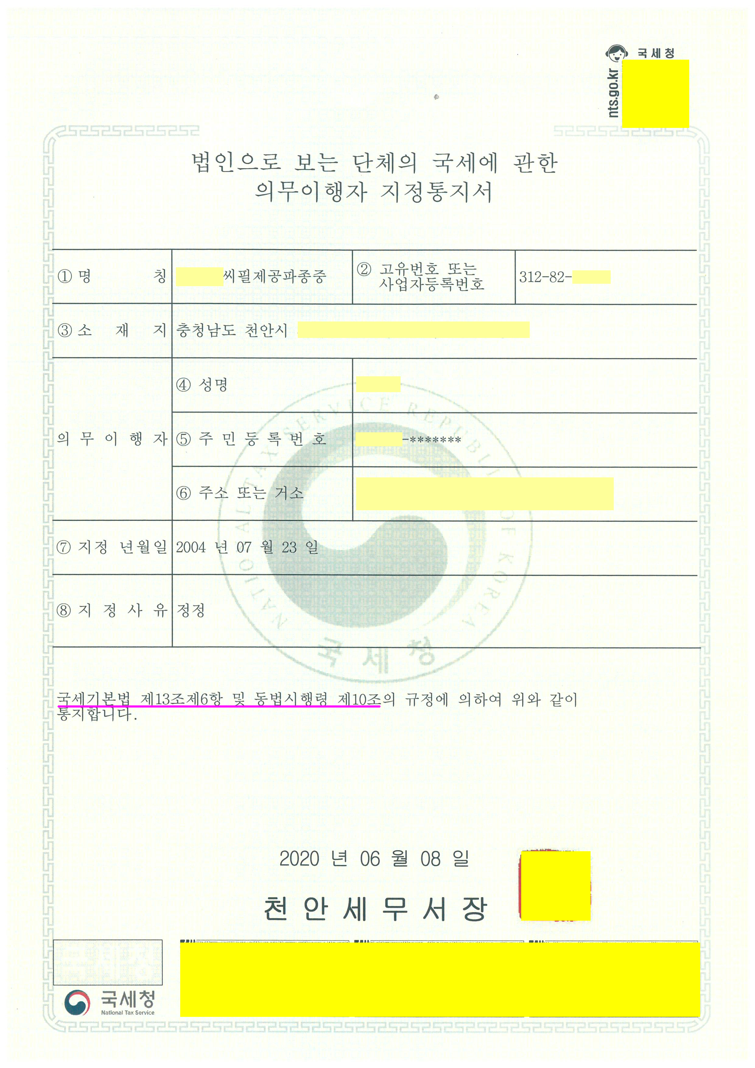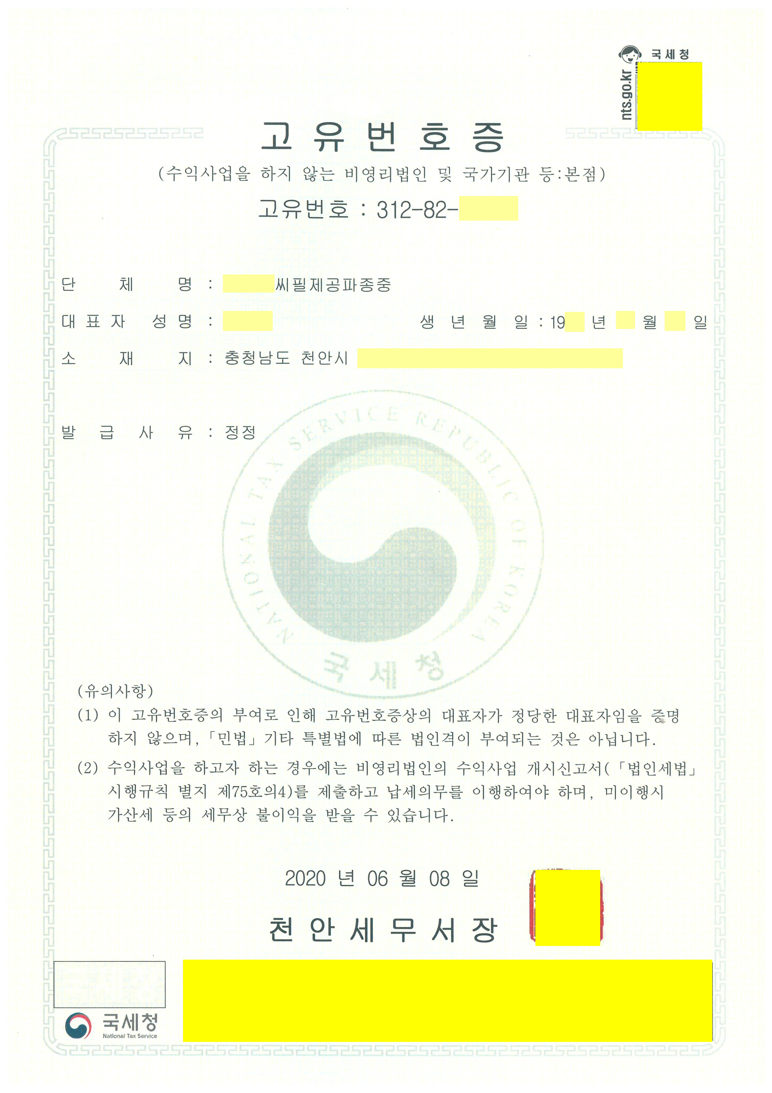 ‘고유번호증’은 법인 등기가 되어 있지 않은 단체 중 ‘독립된 하나의 단체’로 세무서가 승인한 증서다.