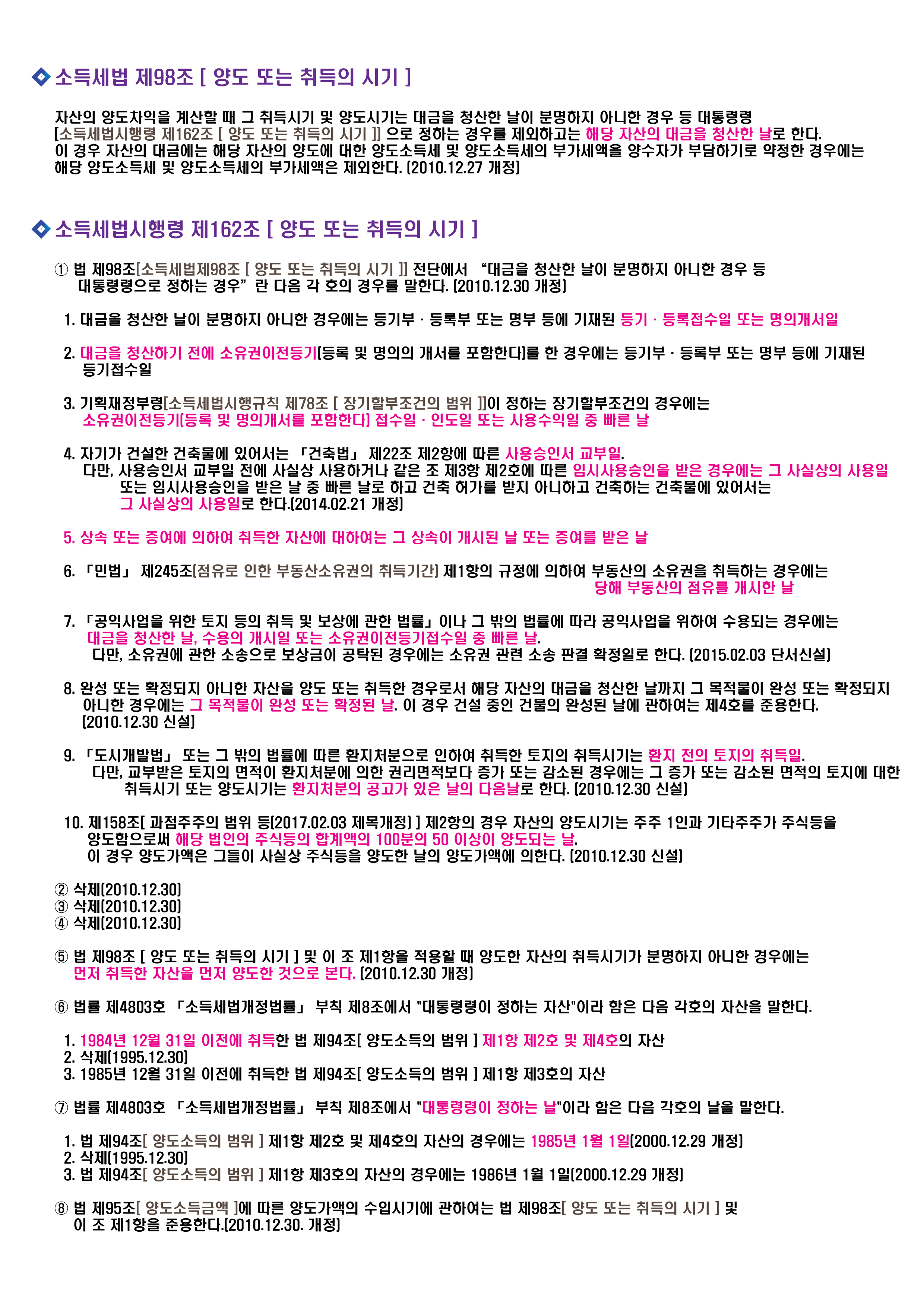 (2) 소득세법 시행령 제162조 【양도 또는 취득의 시기】 ① 법 제98조의 규정에 의한 취득시기 및 양도시기는 다음 각호의 경우를 제외하고는 당해 자산의 대금(당해 자산의 양도에 대한 양도소득세 및 양도소득세의 부가세액을 양수자가 부담하기로 약정한 경우에는 당해 양도소득세 및 양도소득세의 부가세액을 제외한다)을 청산한 날로 한다.