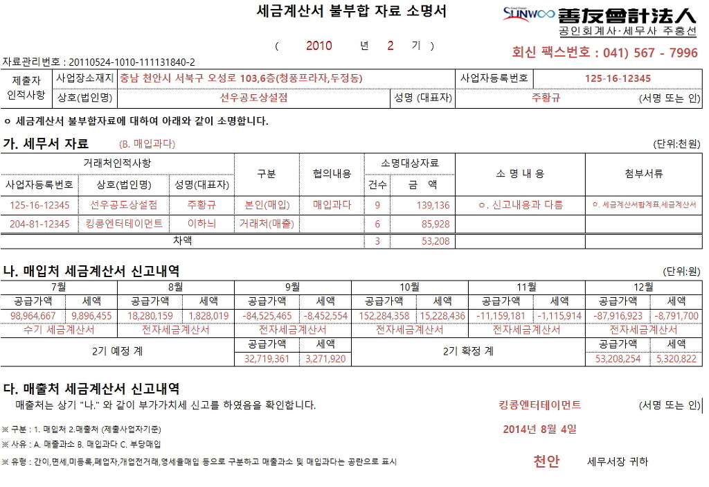 세무서 소명서 해명서 - 주황규실장 작성 작성자주황규|작성시간10.08.23|조회수1,895 목록 댓글 0 글자크기 작게가 글자크기 크게가 납세자해명자료(세무서서식).xlsx 세금계산서 불부합 자료 소명서 - 주황규팀장.xlsx 세금계산서불부합자료소명서.doc 재산취득 자금출처에 대한 소명자료제출.hwp 소명서-만든서식[1]_-_주황규(2013-12-09).hwp 첨부파일첨부된 파일이 7개 있습니다. doc 파일 세금계산서불부합자료소명서.doc 다운로드 hwp 파일 재산취득 자금출처에 대한 소명자료제출.hwp 다운로드 hwp 파일 소명서-만든서식[1]_-_주황규(2013-12-09).hwp 다운로드 xlsx 파일 세금계산서 불부합 자료 소명서 - 주황규팀장.xlsx 다운로드 jpg 파일 세금계산서 불부합.jpg 다운로드 xlsx 파일 납세자해명자료(세무서서식).xlsx 다운로드 jpg 파일 납세자해명자료(세무서서식)_Page_1.jpg 다운로드 다음검색 현재 게시글 추가 기능 열기 북마크 공유하기 신고 센터로 신고 댓글 댓글 0 댓글쓰기 답글쓰기 댓글 리스트