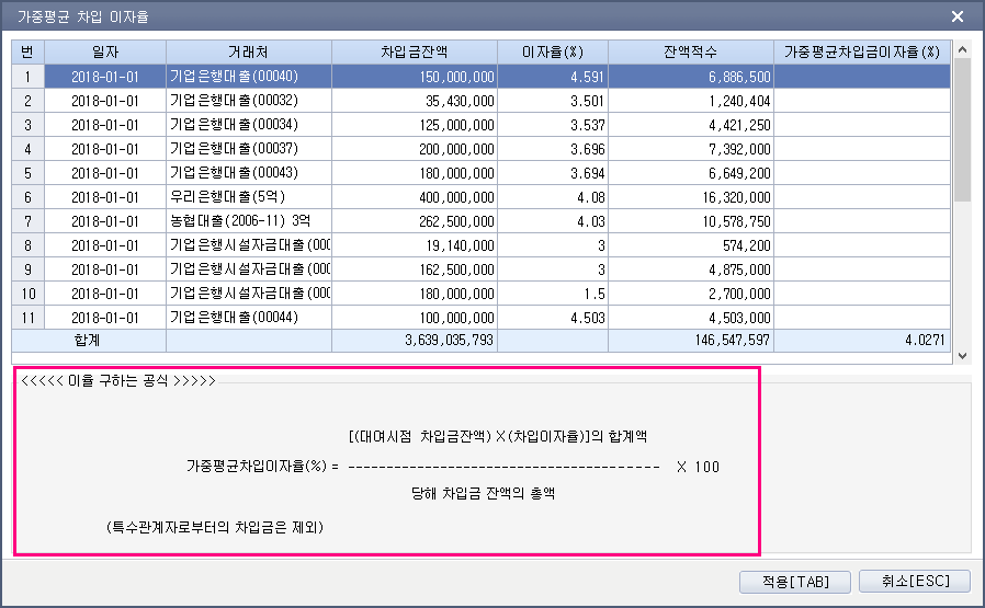 제외한다)에 차입 당시의 각각의 이자율을 곱한 금액의 합계액을 해당 차입금 잔액의 총액으로