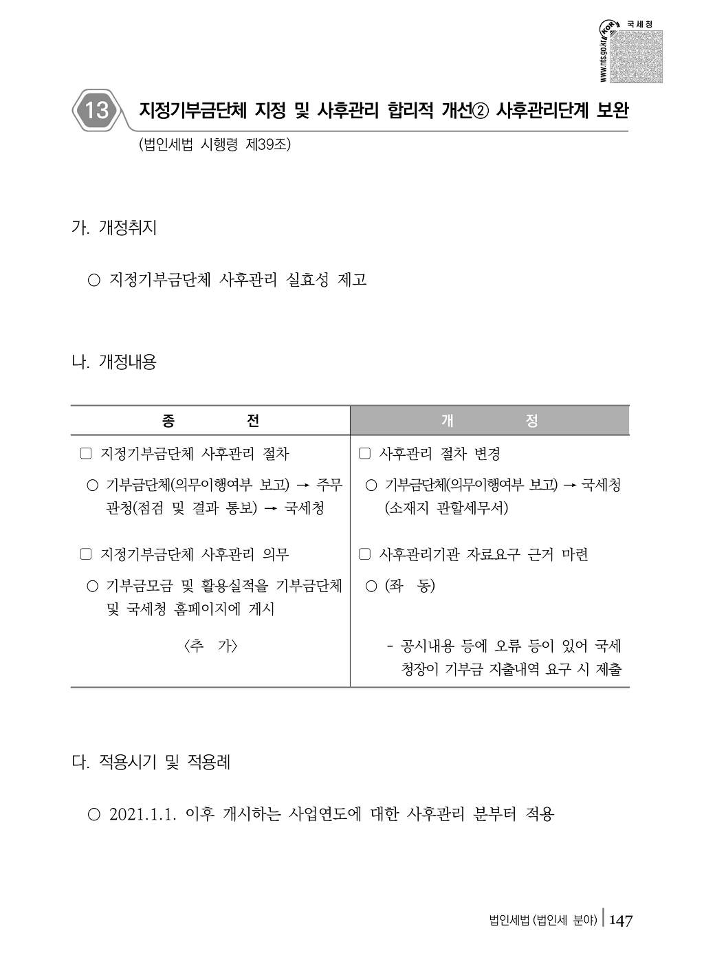 13 - 지정기부금단체 지정 및 사후관리 합리적 개선② 사후관리단계 보완 (법인세법 시행령 제39조) 작성자주황규|작성시간20.09.18|조회수85 목록 댓글 0 글자크기 작게가 글자크기 크게가 다음검색 현재 게시글 추가 기능 열기 북마크 공유하기 신고 센터로 신고 댓글 댓글 0 댓글쓰기 답글쓰기 댓글 리스트