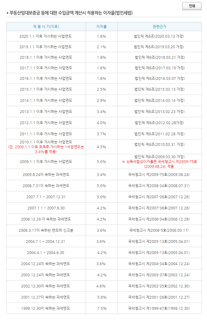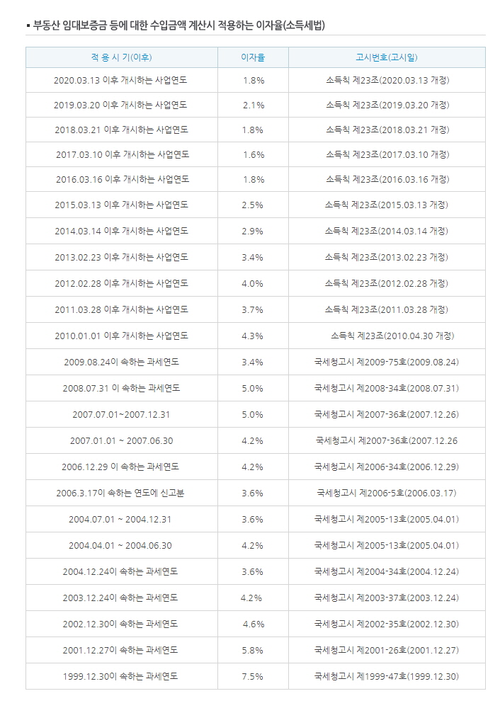 *주) :2020.1.1. 이후 최초로 개시하는 사업연도분부터 정기예금이자율은 연 1.8%를 적용한다. (법령 §11[수익의 범위] 1호 단서, 법칙[정기예금이자율] §6)>