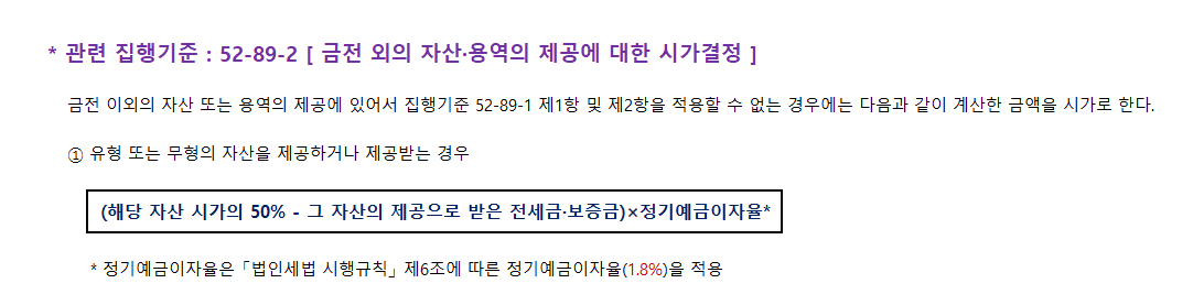 시가(적정임대료) = (해당 자산의 시가의 50% - 그 자산의 제공과 관련하여 받은 전세금 또는 보증금) × 정기예금이자율 *주)