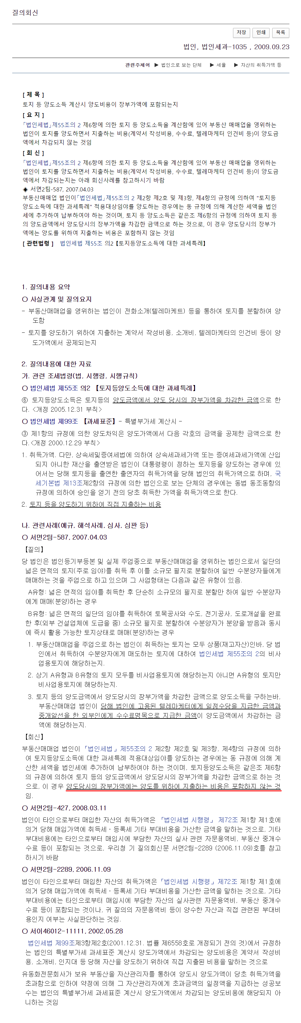 *법인세법 제55조의 2 규정을 적용함에 있어 토지등양도소득은 토지 등의 양도금액에서 양도당시의 장부가액을 차감한 금액으로 계산하는 것인바 양도금액은 토지 등의 양도로 인하여 발생한 익금을 말하며, 장부가액이라 함은 세무상 장부가액으로 세무상 취득가액에 세무상 감가상각충당금과 세무상 평가차액을 가감한 금액으로 하는 것이며, 법인이 토지등양도차익은 양도금액에서 양도당시의 장부가액을 차감한 금액으로 실거래가액으로 계산하는 것으로 기준시가로 계산할 수 없다(서면2팀-1693, 2005.10.21.).