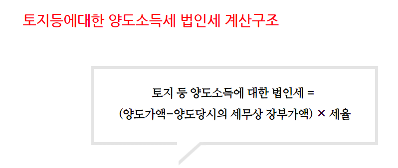 | o 토지등양도소득=양도가액-양도당시의 장부가액 o 토지등양도소득에 대한 법인세=토지등양도소득×세율 |