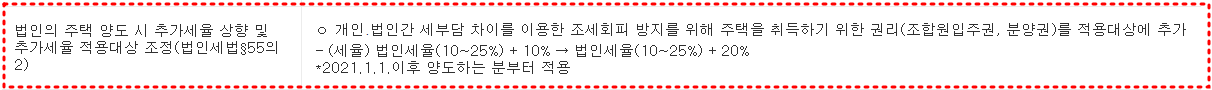 ① 내국법인이 다음 각 호의 어느 하나에 해당하는 토지, 건물(건물에 부속된 시설물과 구축물을 포함한다), 주택을 취득하기 위한 권리로서 「소득세법」 제88조(정의)제9호에 따른 조합원입주권 및 같은 조 제10호에 따른 분양권(이하 이 조 및 제95조의2에서 “토지등”이라 한다)을 양도한 경우에는 해당 각 호에 따라 계산한 세액을 토지등 양도소득에 대한 법인세로 하여 제13조(과세표준) 에 따른 과세표준에 제55조(세율) 에 따른 세율을 적용하여 계산한 법인세액에 추가하여 납부하여야 한다.