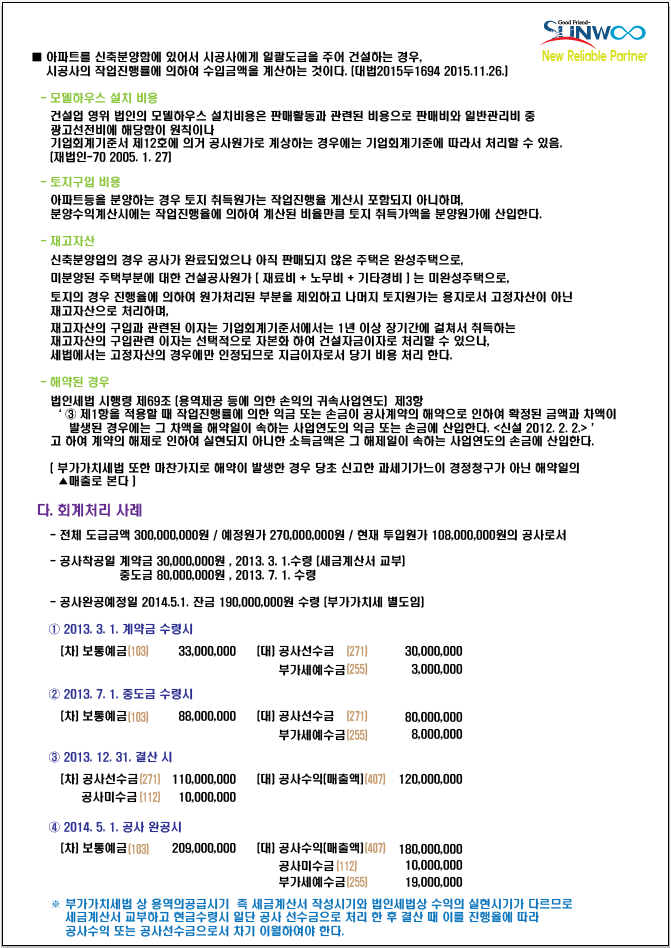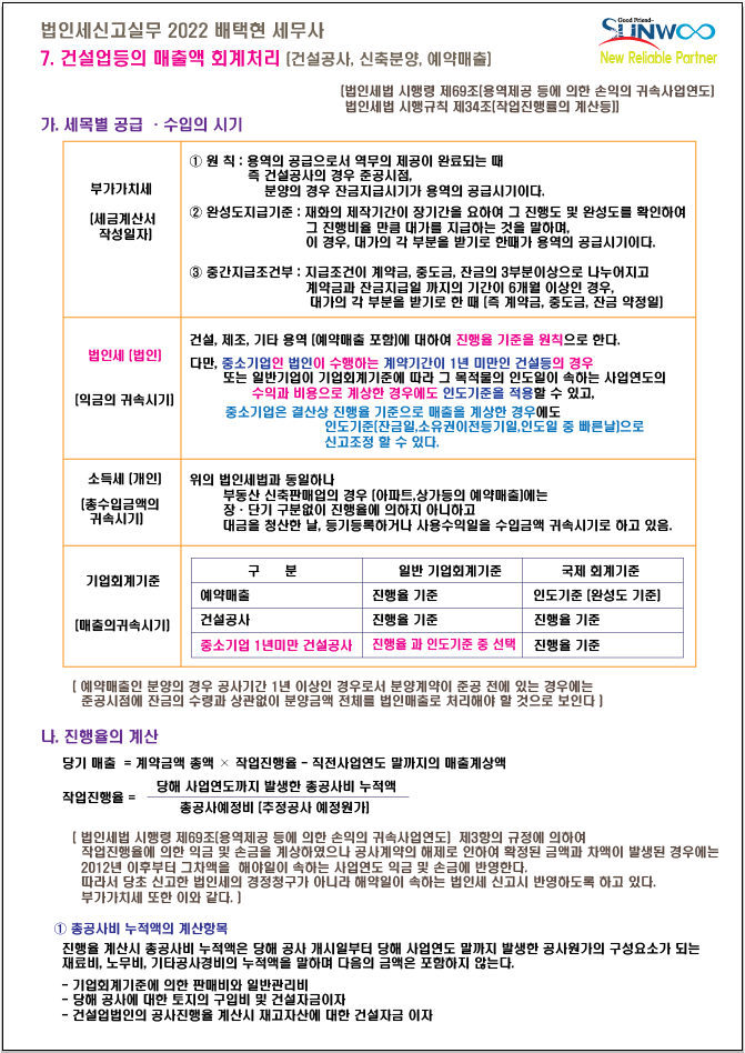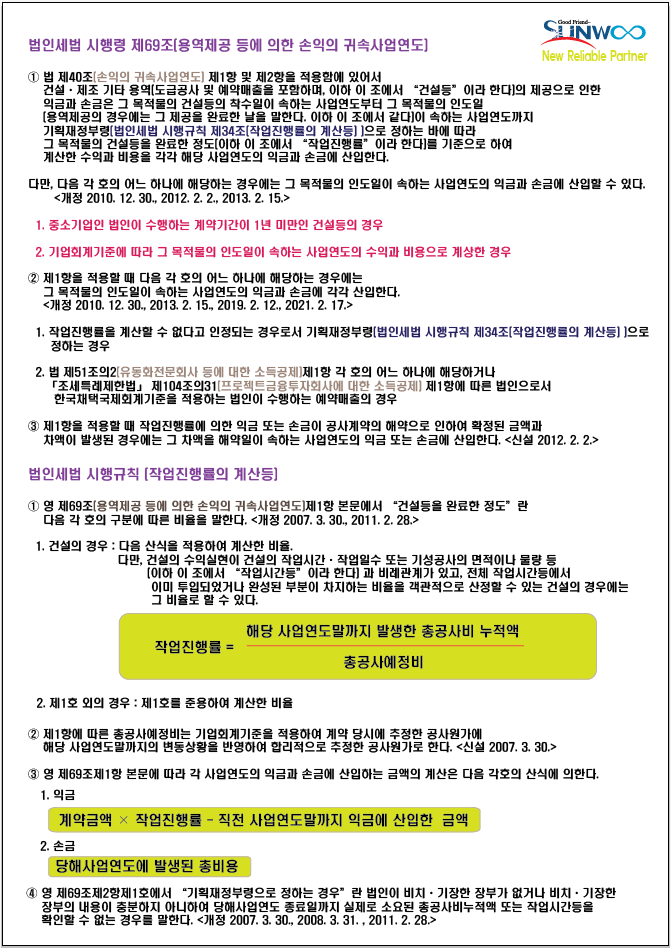 건설업등의 매출액 회계처리 (건설공사 , 신축분양 , 예약매출) 법령 제69조 용역제공 등에 의한 손익의 귀속사업연도 (진행률,인도일)