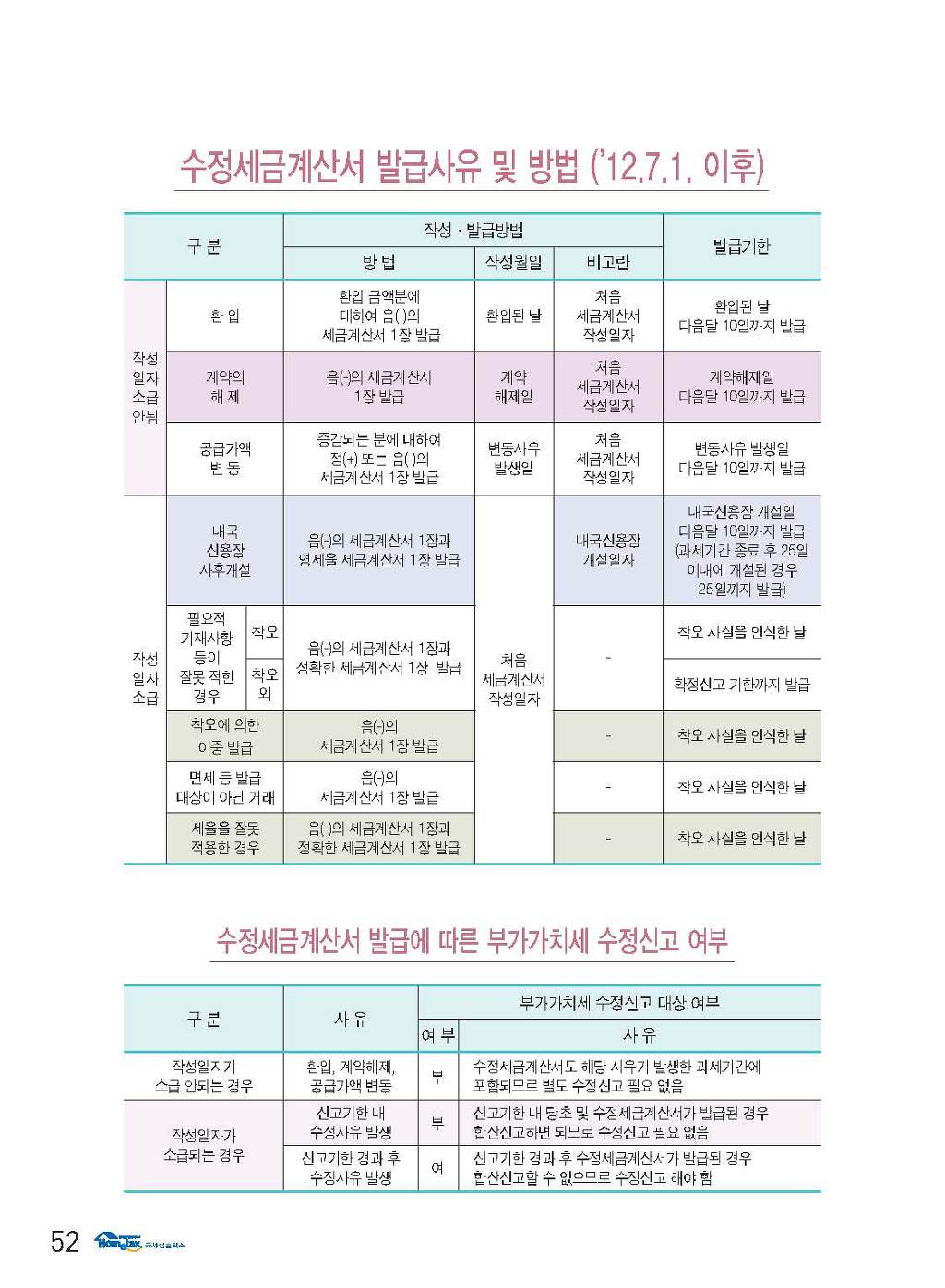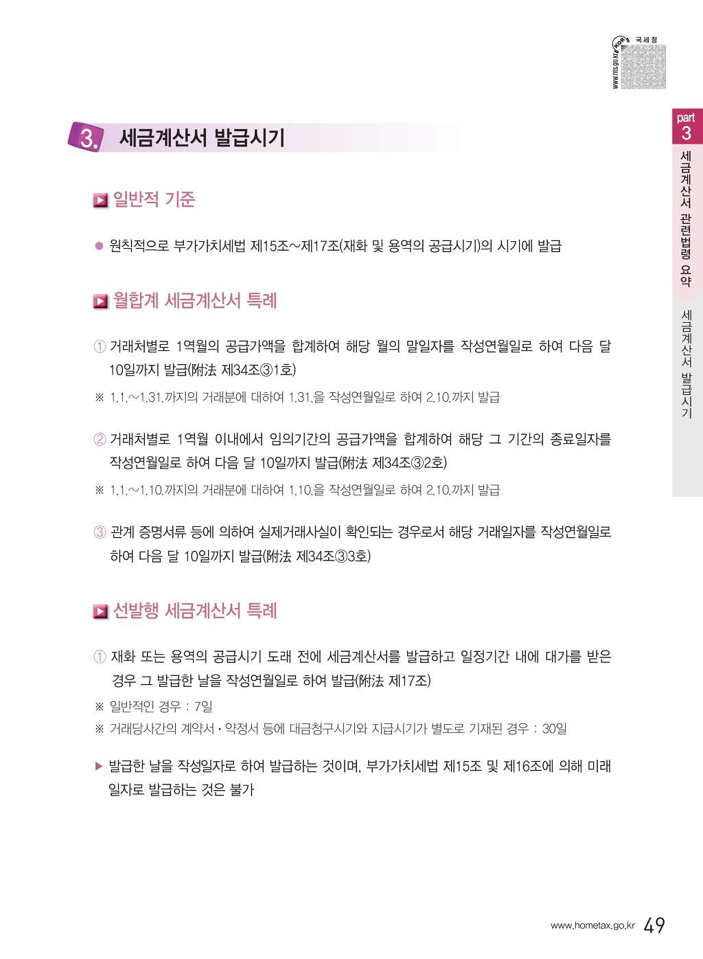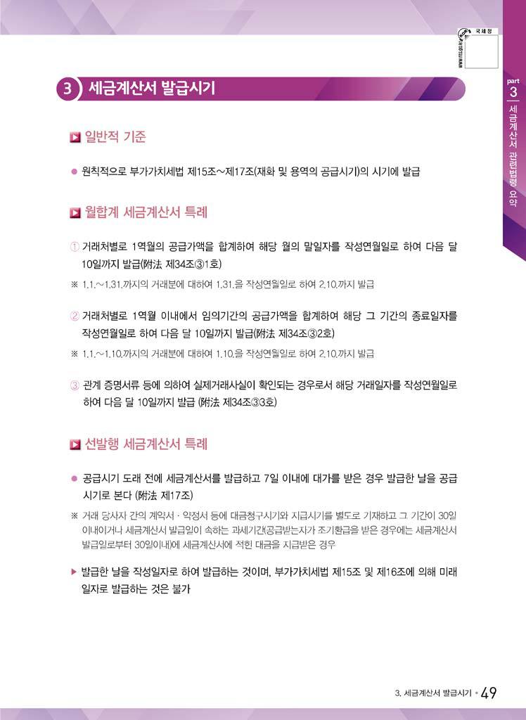 ※ 1역월이라 함은 달력상의 월을 말하는 것으로 1역월을 벗어나 발급할 수 없음 - 선발행 세금계산서 발급특례(법 9 ③, 영 54 ②,③) i ) 공급시기 도래전에 대가의 전부 또는 일부를 받고, 그 받은 대가에 대하여 그 대가를 받은 날부터 공급시기까지 세금계산서 또는 영수증 발급 가능 ⅱ) 공급시기 도래전에 세금계산서를 발급한 후 7일 이내에 대가를 지급받는 경우 ⅲ) 공급시기 도래전에 세금계산서를 발급한 후 7일 경과 후에 대가를 지급받는 때에는 아래 요건을 모두 충족하는 경우 ㆍ계약서 등에 대금청구시기와 지급시기가 별도로 기재될 것 ㆍ대금청구시기와 지급시기 사이의 기간이 30일 이내일 것 ※ ⅱ), ⅲ)의 개정규정은 2007.02.28.이 속하는 과세기간의 공급분부터 적용 ⅲ) 의 요건 중 대금청구시기에 세금계산서를 발급받고 공급받는 자가 전사적 자원관리시스템(ERP)에 보관해야 하는 요건을 2013.2.15.이후 재화 또는 용역을 공급하거나 공급받는 분부터 삭제함 ※ 받는 대가에는 현금 외에 수표, 어음, 신용카드, 전자화폐, 현물의 인도(양도) 등이 포함 ![]()