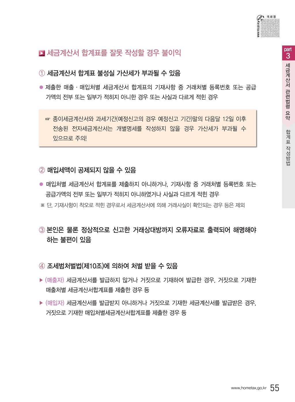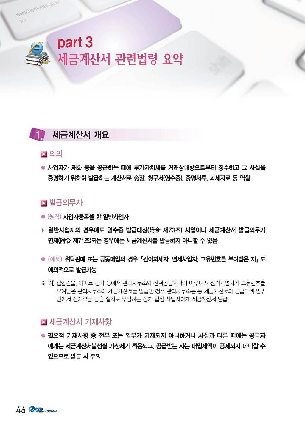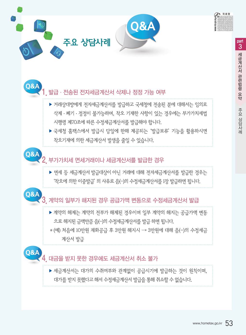 ※ 1역월이라 함은 달력상의 월을 말하는 것으로 1역월을 벗어나 발급할 수 없음 - 선발행 세금계산서 발급특례(법 9 ③, 영 54 ②,③) i ) 공급시기 도래전에 대가의 전부 또는 일부를 받고, 그 받은 대가에 대하여 그 대가를 받은 날부터 공급시기까지 세금계산서 또는 영수증 발급 가능 ⅱ) 공급시기 도래전에 세금계산서를 발급한 후 7일 이내에 대가를 지급받는 경우 ⅲ) 공급시기 도래전에 세금계산서를 발급한 후 7일 경과 후에 대가를 지급받는 때에는 아래 요건을 모두 충족하는 경우 ㆍ계약서 등에 대금청구시기와 지급시기가 별도로 기재될 것 ㆍ대금청구시기와 지급시기 사이의 기간이 30일 이내일 것 ※ ⅱ), ⅲ)의 개정규정은 2007.02.28.이 속하는 과세기간의 공급분부터 적용 ⅲ) 의 요건 중 대금청구시기에 세금계산서를 발급받고 공급받는 자가 전사적 자원관리시스템(ERP)에 보관해야 하는 요건을 2013.2.15.이후 재화 또는 용역을 공급하거나 공급받는 분부터 삭제함 ※ 받는 대가에는 현금 외에 수표, 어음, 신용카드, 전자화폐, 현물의 인도(양도) 등이 포함 ![]()