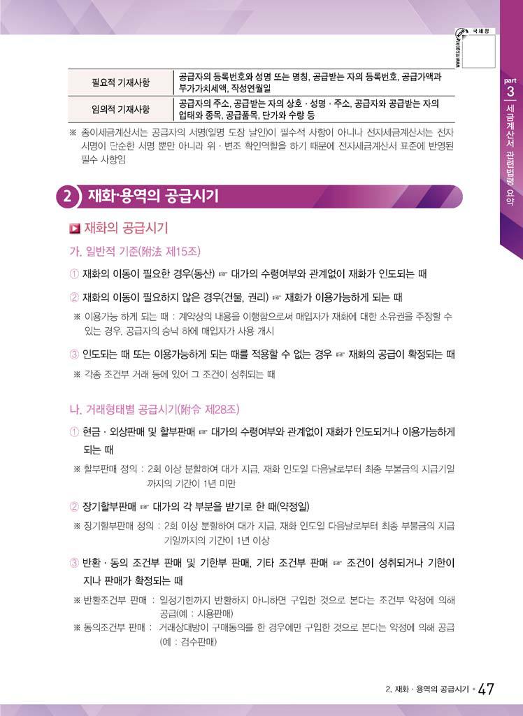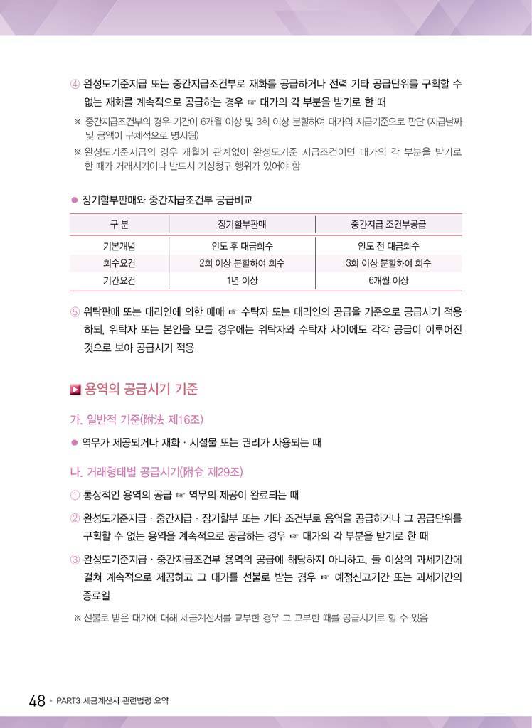 。중간지급조건부 | 。다음에 해당하는 중간지급조건부의 경우 대가의 각 부분을 받기로 한 때 1. 계약금을 받기로 한 날의 다음 날부터 용역의 제공을 완료하는 날까지의 기간이 6개월 이상인 경우로서 그 기간 이내에 계약금 외의 대가를 분할하여 받는 경우 2. 「국고금 관리법」제26조에 따라 경비를 미리 지급받는 경우 3. 「지방회계법」제35조에 따라 선금급을 지급받는 경우 |