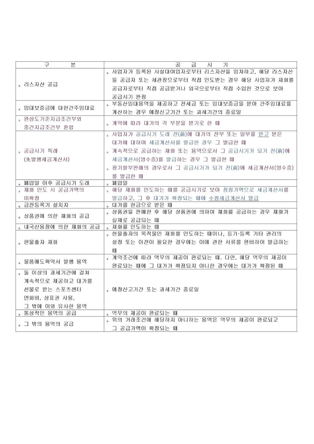 。계속적 공급 | 。전력 기타 공급단위를 구획할 수 없는 재화 또는 용역을 계속적으로 공급하는 경우 대가의 각 부분을 받기로 한 때 |