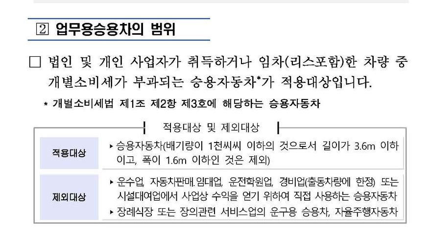 1. 「부가가치세법 시행령」 제19조 각 호에 따른 업종 또는 「여신전문금융업법」 제2조 제9호에 해당하는 시설대여업에서 사업상 수익을 얻기 위하여 직접 사용하는 승용자동차(2016.02.17 신설)