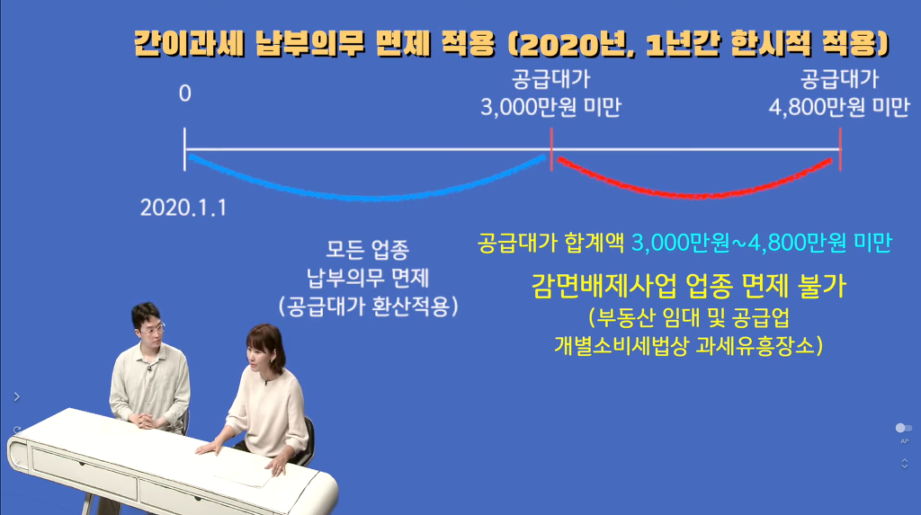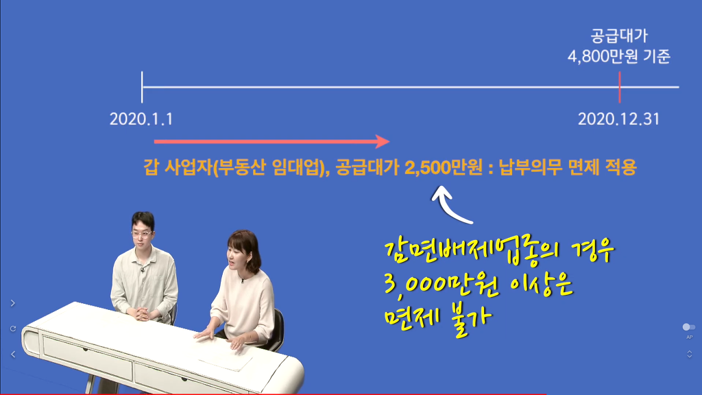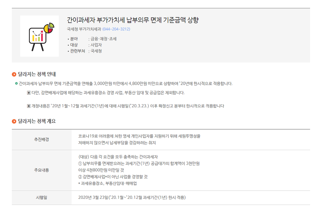 코로나19로 피해를 입은 간이과세자를 지원하기 위하여 공급대가가 연간 3천만 원 이상 4천8백만 원 미만인 간이과세자도 2020년분 부가가치세 납부의무를 면제하도록 하였다.