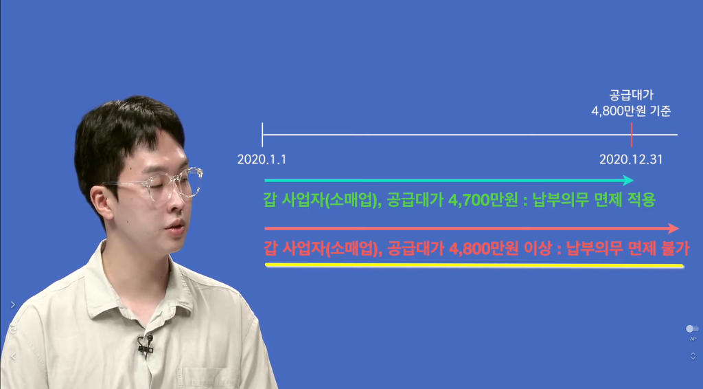 부가가치세 간이과세자 - 1년 매출액 4,800만원 미만 / 납부면제(2018~) 3천만원 , 2020년귀속(업종제한) 4천8백만원 미만