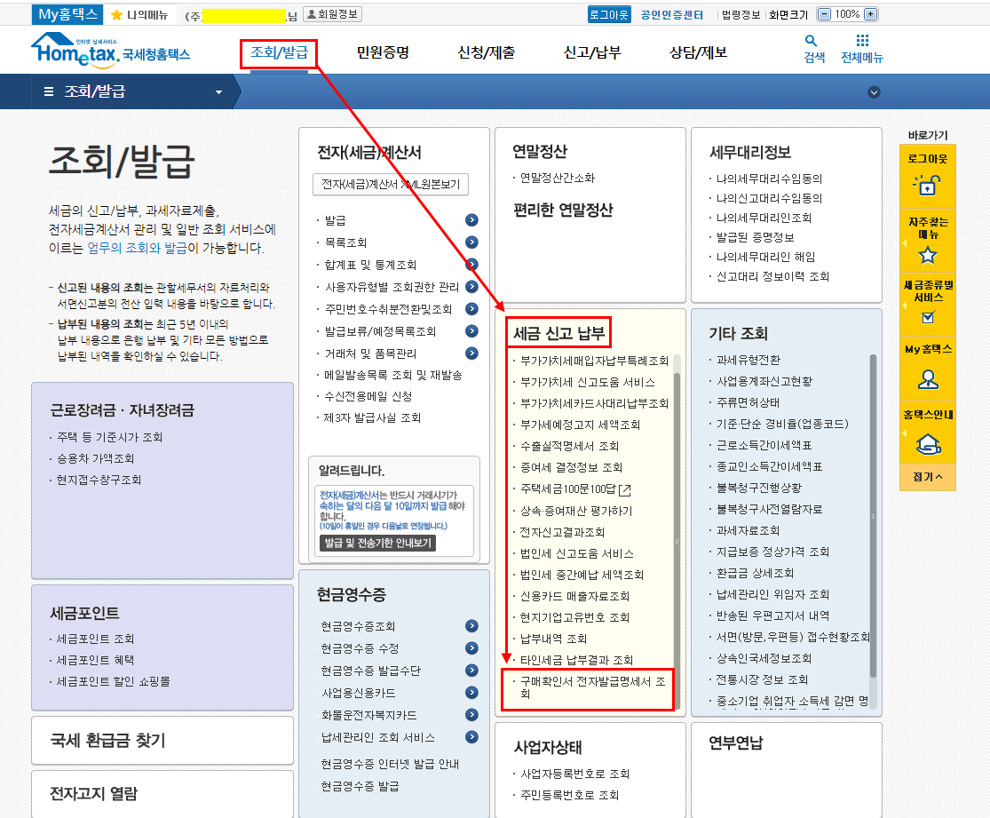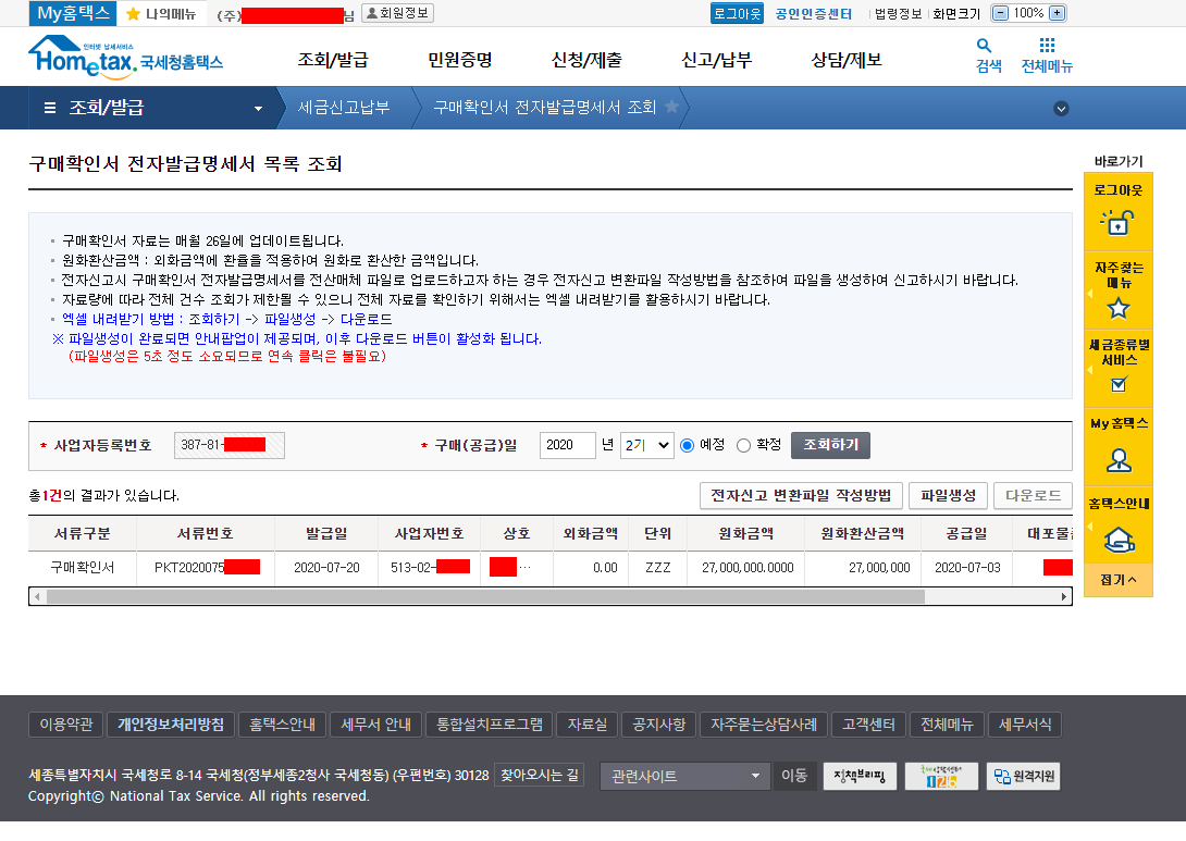 작성자주황규작성시간20.10.23조회수1,983 목록 댓글 0구매확인서 (접근경로) 홈택스 > 조회/발급 > 세금신고납부 > 구매확인서 전자발급명세서 조회
