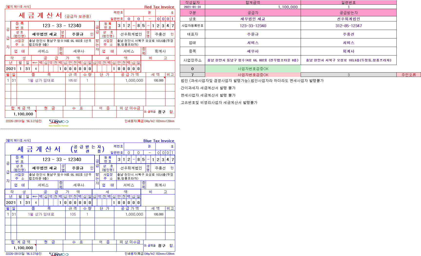 ex). 100만원 매출시 8.8% 공급가액 88,000원 세액 8,800원 합계금액 96,800원을 세금계산서 발급해줌.