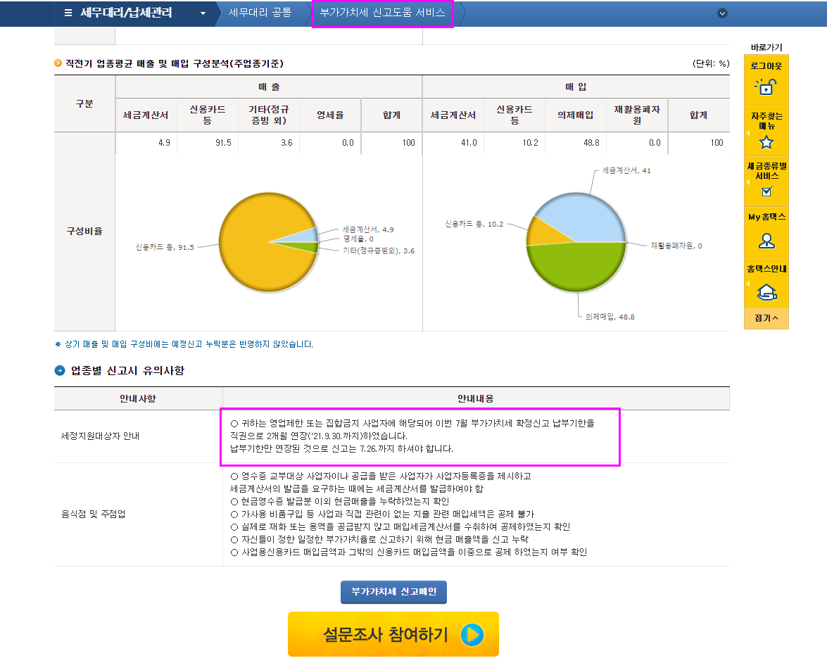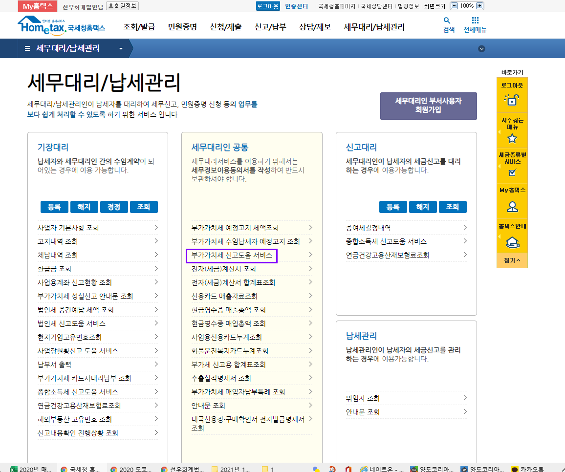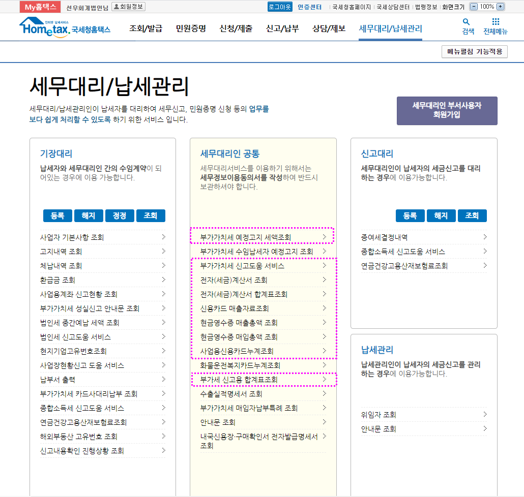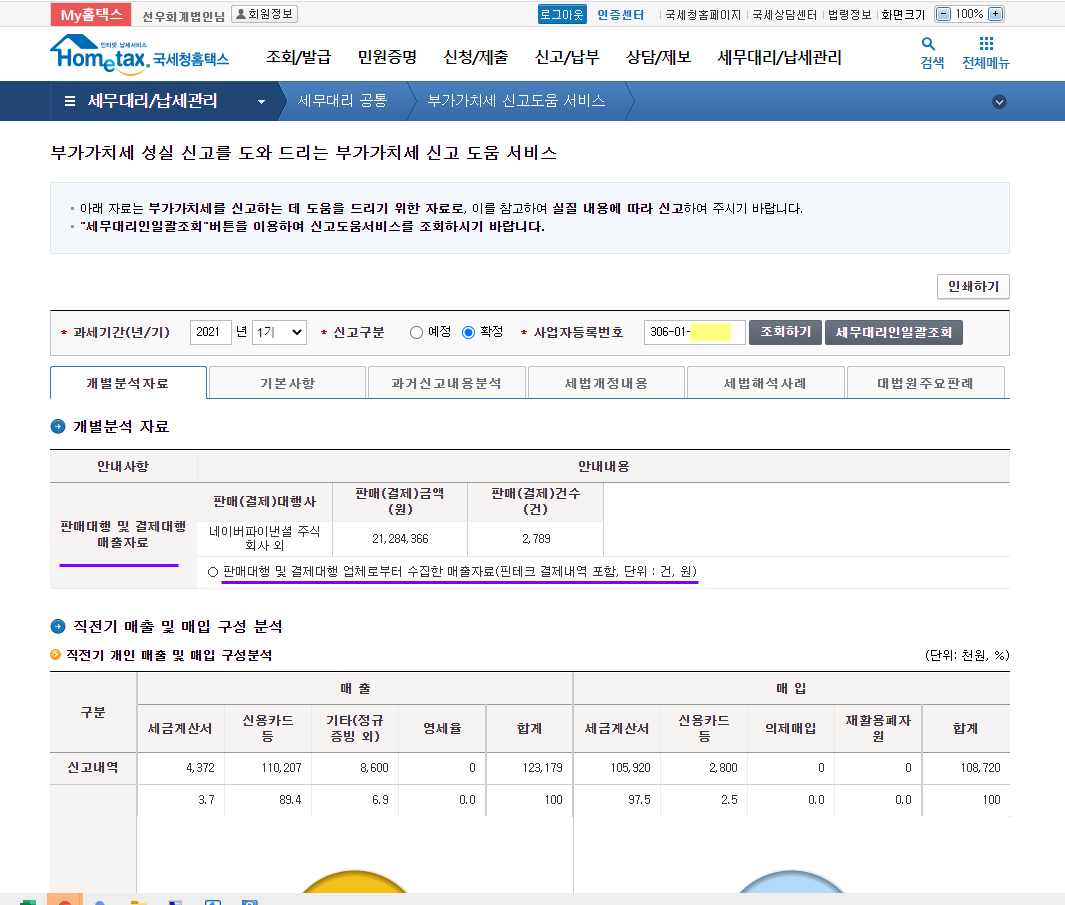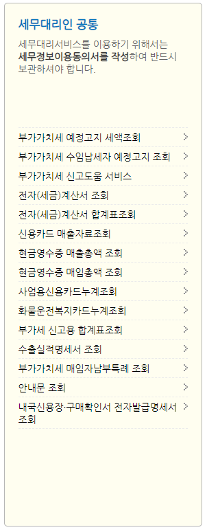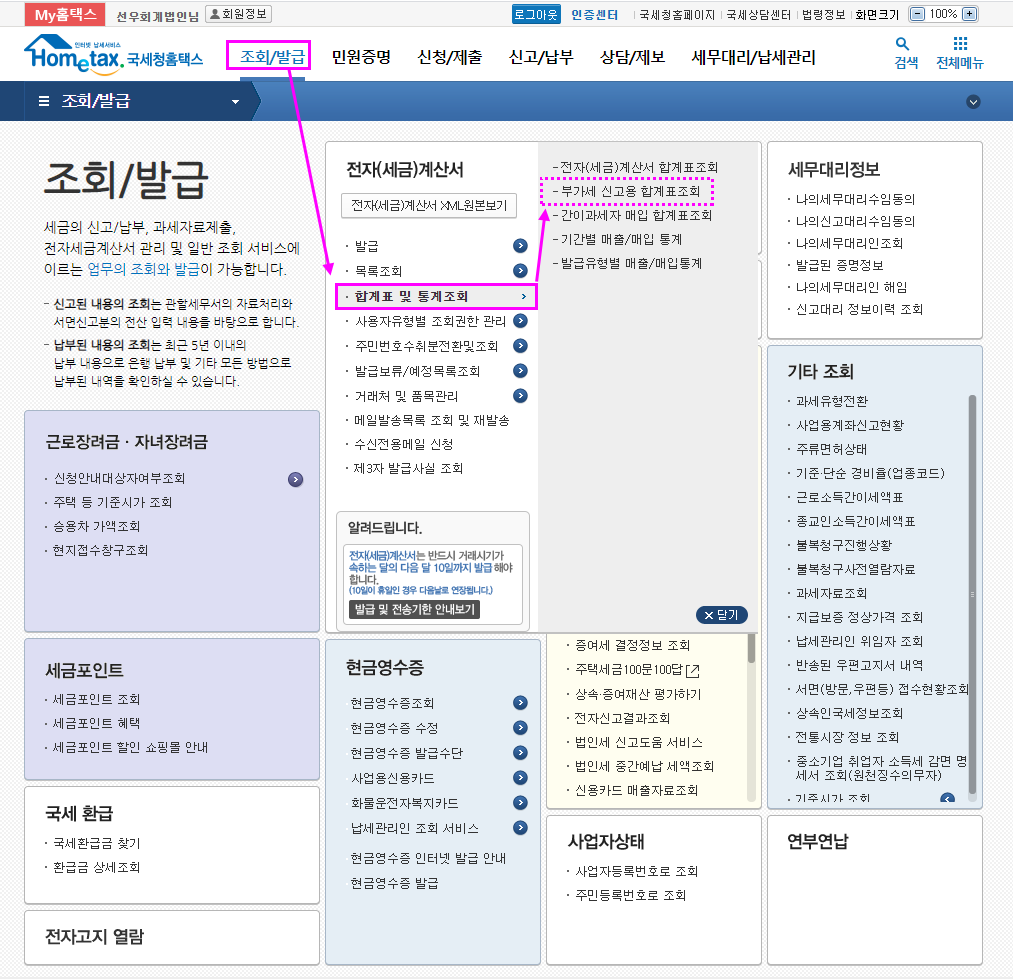 홈택스의 "부가세신고용 합계표조회" 메뉴는