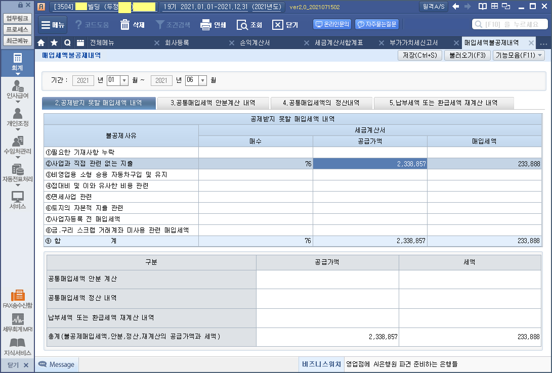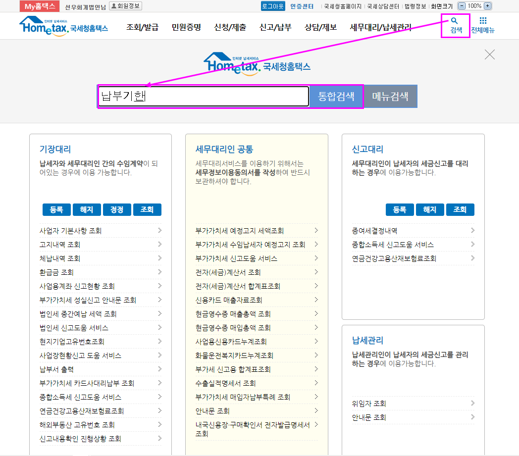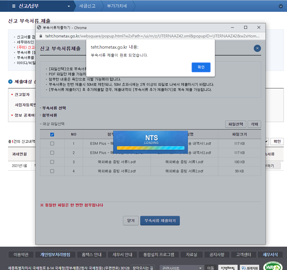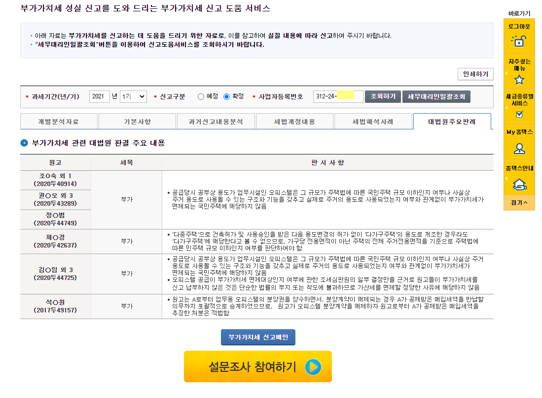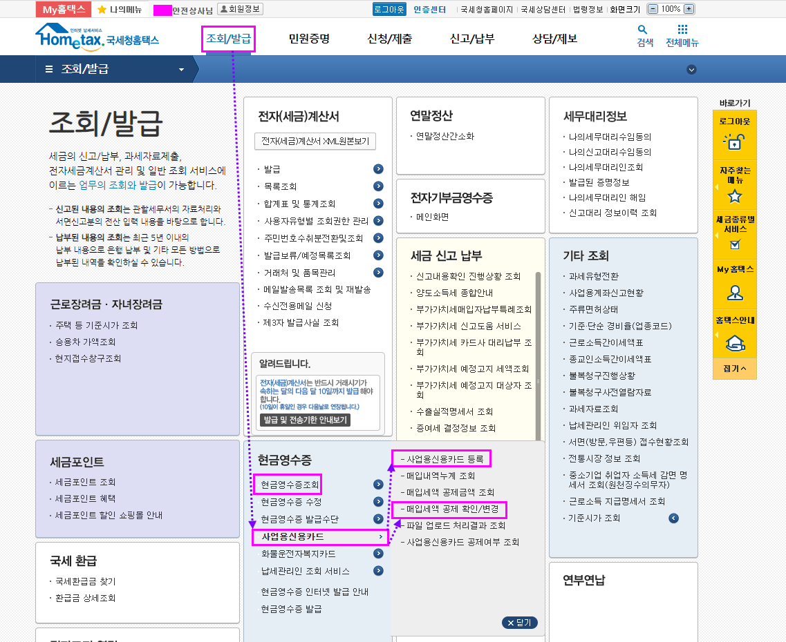 홈택스의 "부가세신고용 합계표조회" 메뉴는