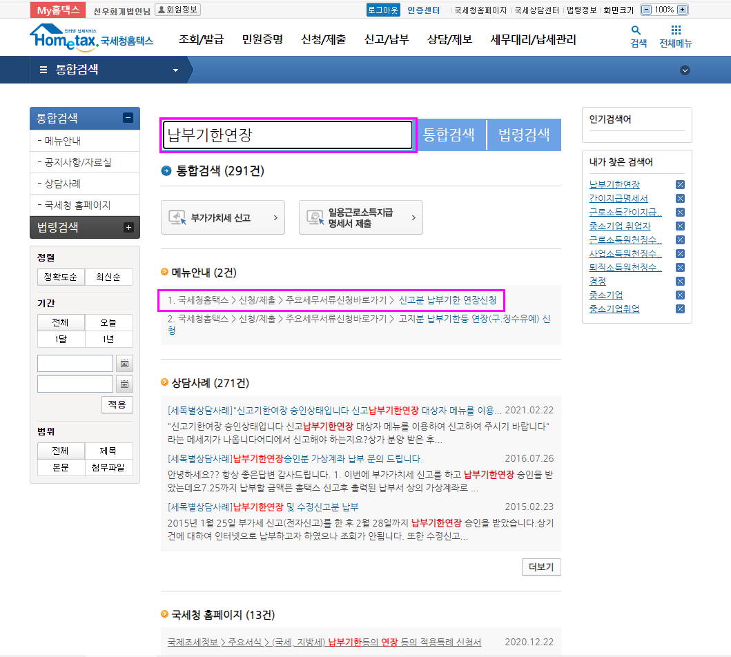 최종 분기의 다음달 10일의 다다음날 메뉴에 나타 납니다. (월합계세금계산서 발급일의 다음날은 전송기한이므로 다다음날) 2021년 1기확정의 경우 2021.7.14.